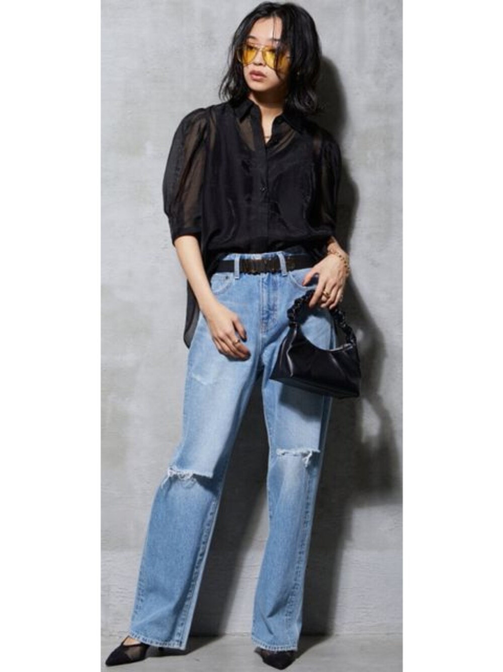 nissen Smile Models(nissen本店models)のデニムパンツ「<大きいサイズ>綿100%クラッシュ加工ワイドストレートデニムパンツ GEVS.」を使ったコーディネート