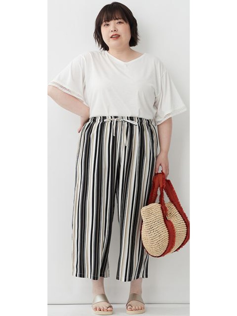 nissen Smile Models(nissen本店models)のTシャツ/カットソー「大きいサイズ 5分袖レース付VネックゆるTシャツ」を使ったコーディネート