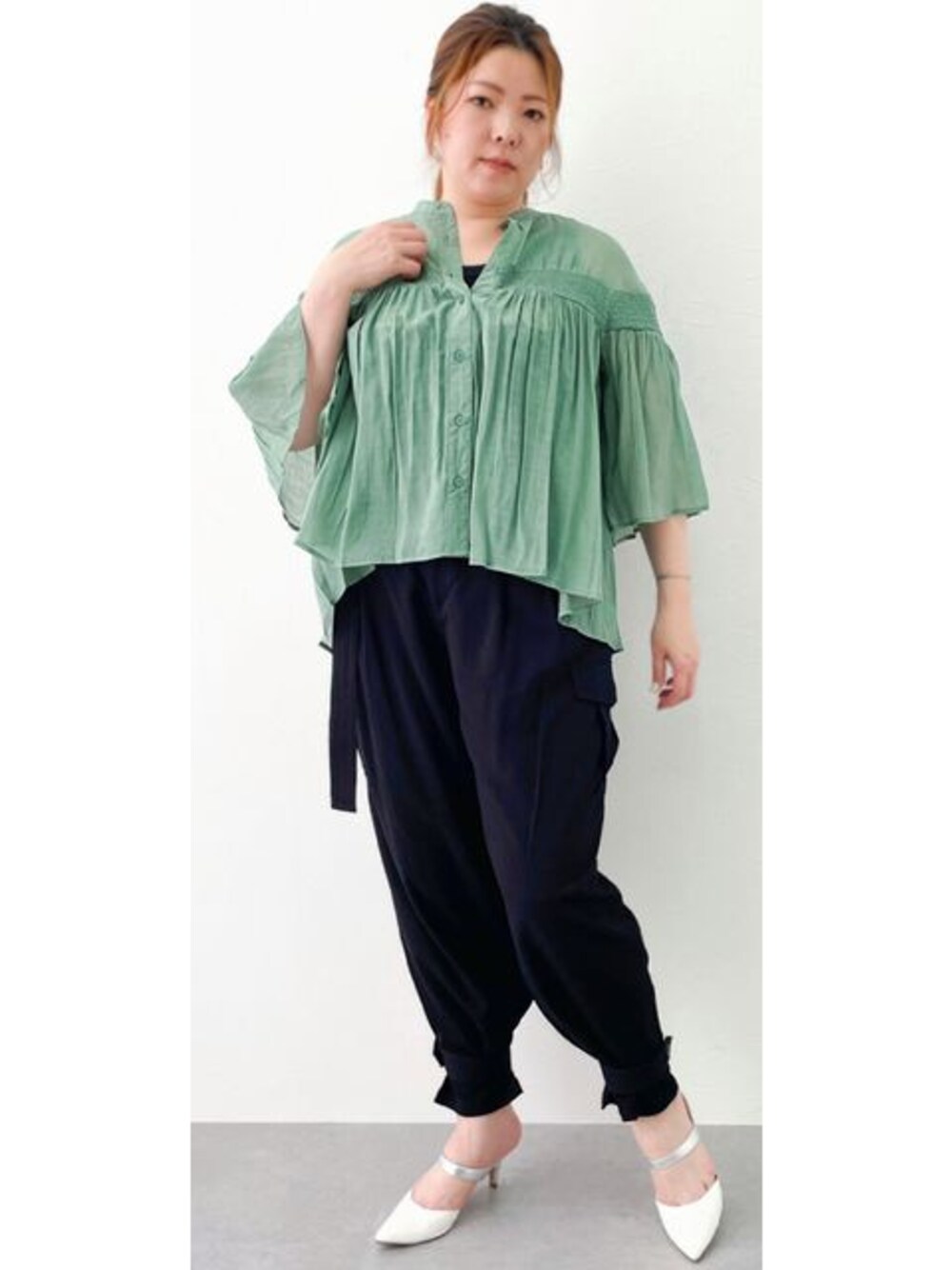 nissen Smile Models(nissen本店models)のシャツ/ブラウス「<大きいサイズ>ゴムシャーリングブラウス シックスタイル」を使ったコーディネート