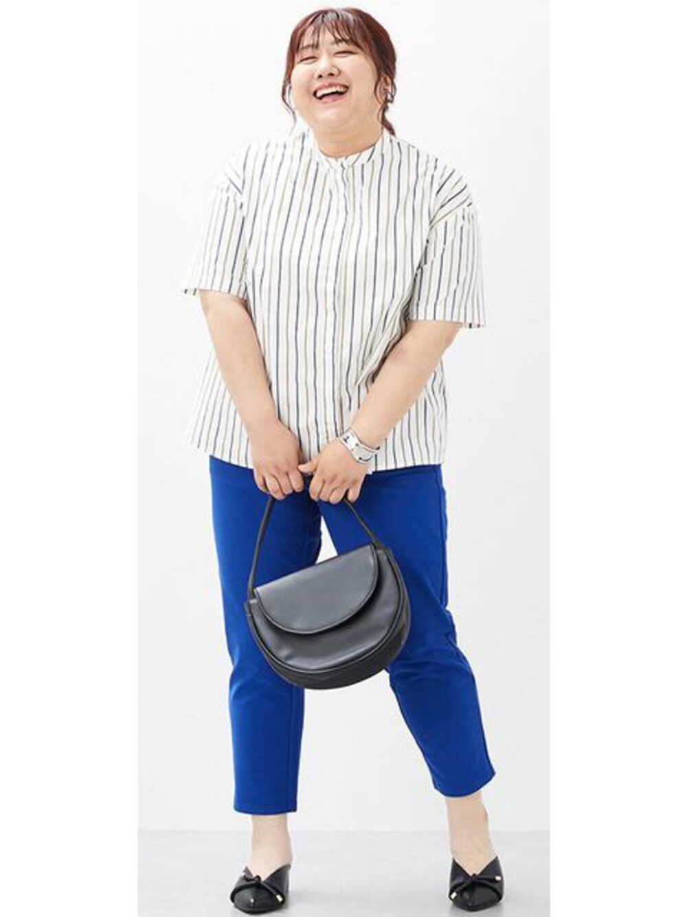 nissen Smile Models(nissen本店models)のシャツ/ブラウス「大きいサイズゴールドボタンマルチストライプバンドカラーシャツ」を使ったコーディネート