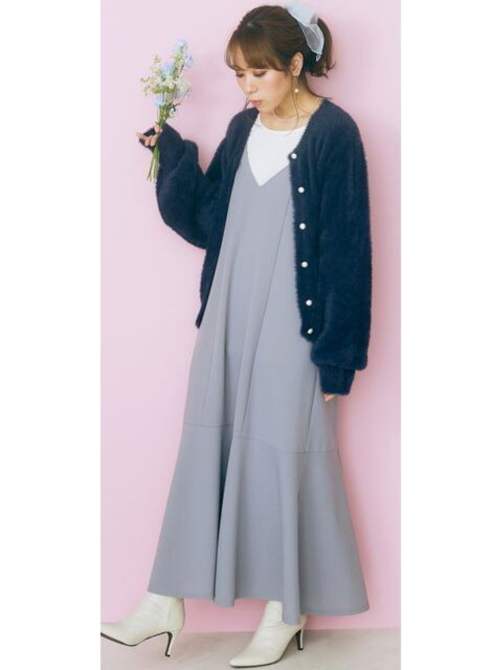 nissen Smile Models(nissen本店models)のカーディガン/ボレロ「<大きいサイズ> パール調ボタン付きシャギーニットカーディガン marun」を使ったコーディネート