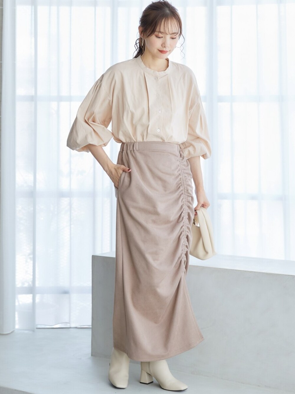 nissen Smile Models(nissen本店models)のスカート「大きいサイズ シャーリングスカート miclat」を使ったコーディネート