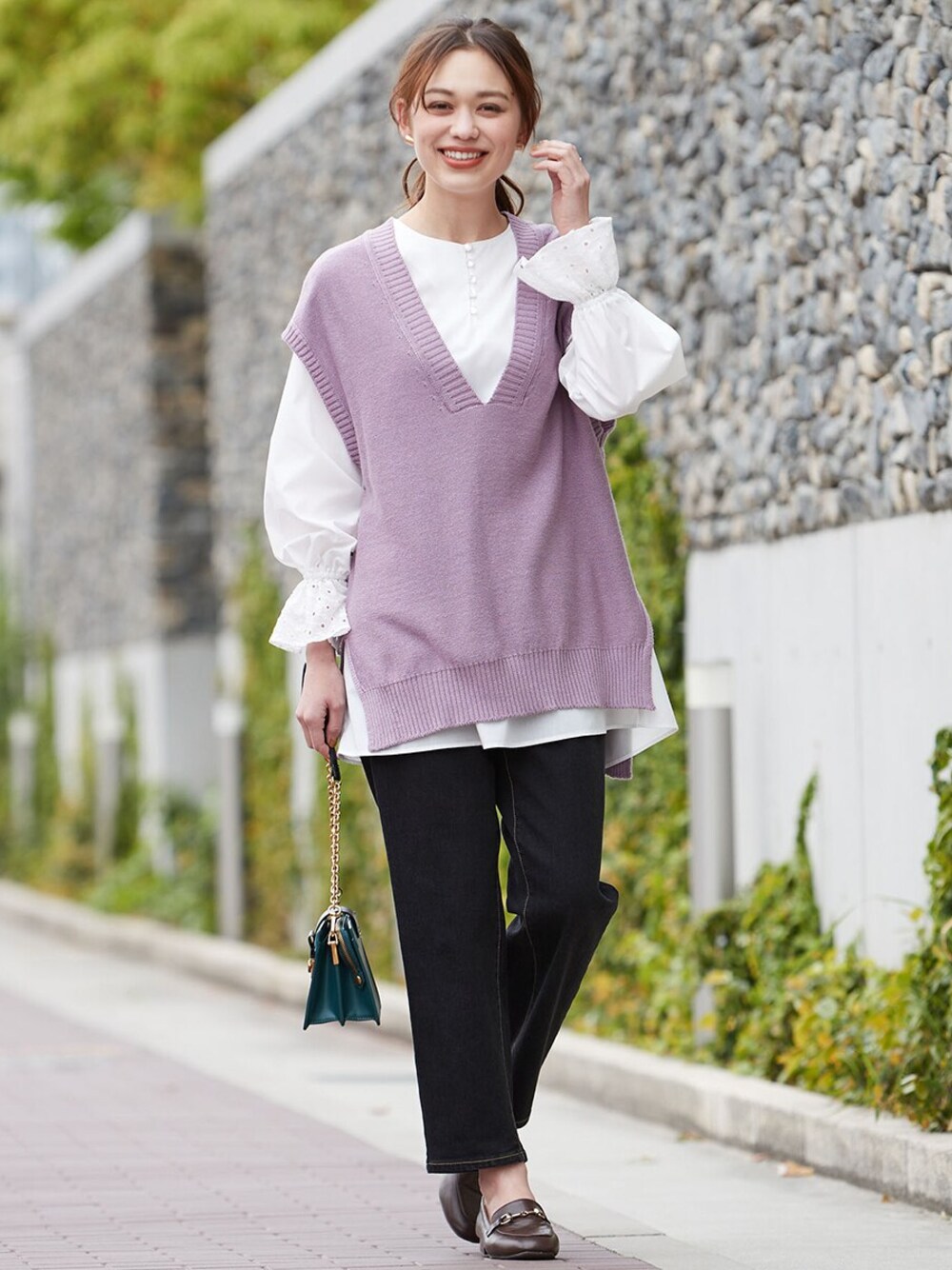 nissen Smile Models(nissen本店models)のベスト「大きいサイズドロップショルダーVネックデザインニットベスト」を使ったコーディネート