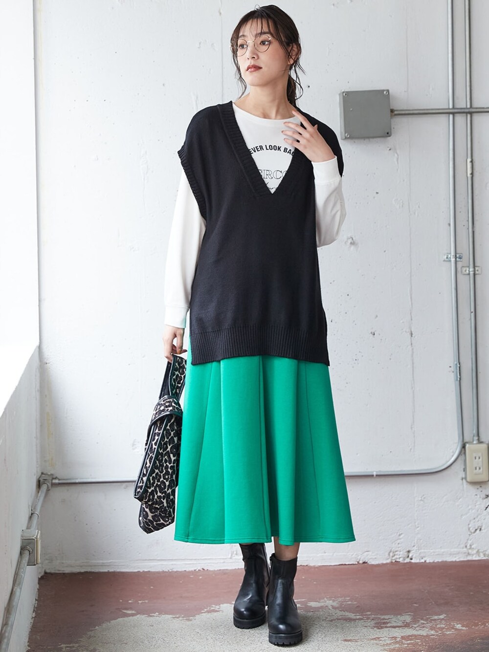 nissen Smile Models(nissen本店models)のベスト「大きいサイズドロップショルダーVネックデザインニットベスト」を使ったコーディネート
