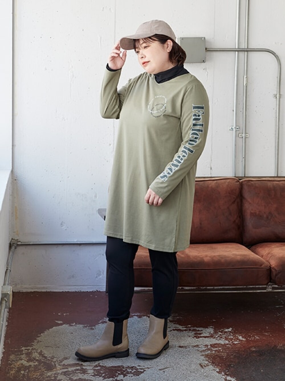 nissen Smile Models(nissen本店models)のチュニック「大きいサイズデザインいろいろ選べる綿混プリントカットソーチュニック」を使ったコーディネート