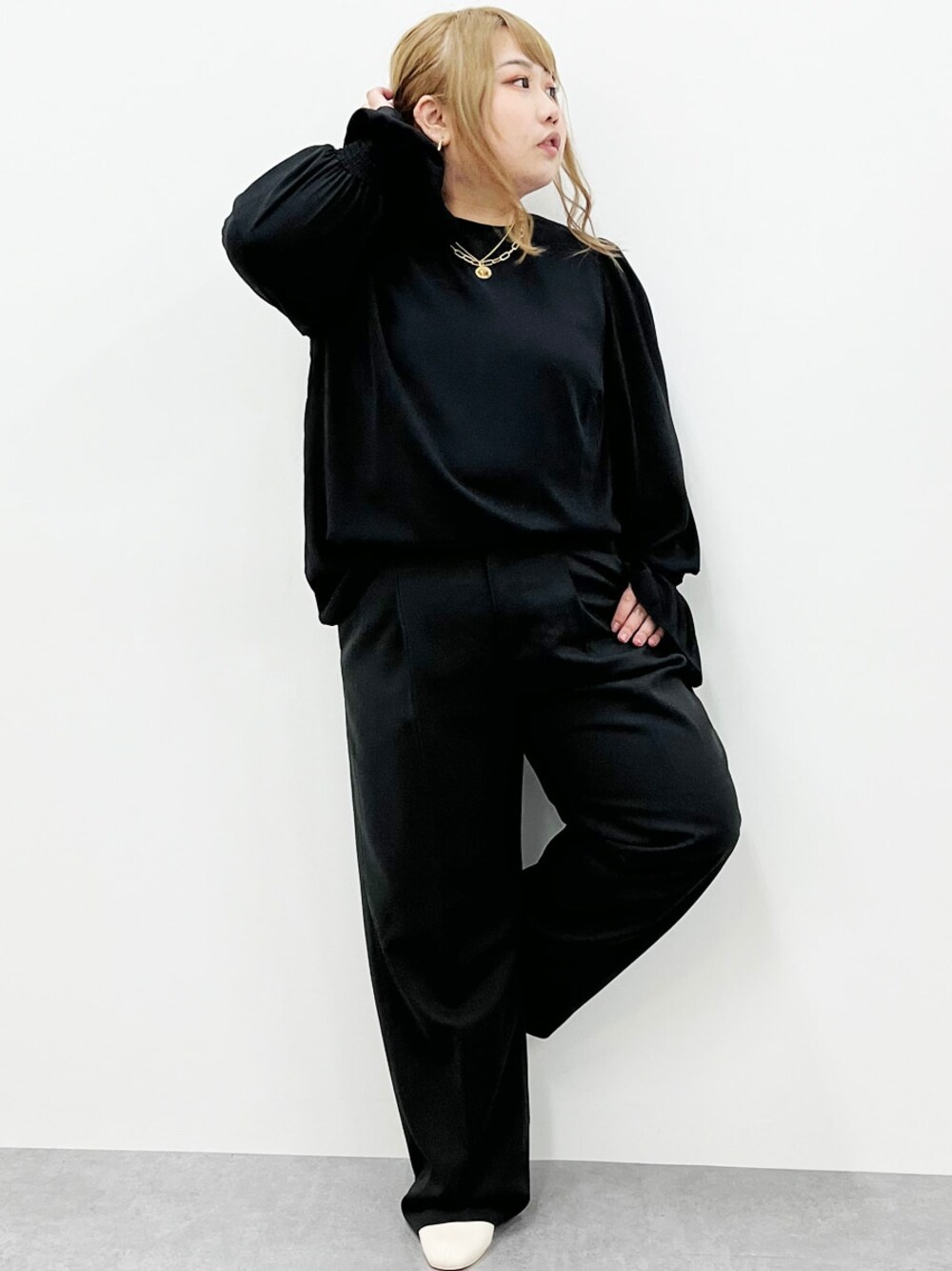 nissen Smile Models(nissen本店models)のシャツ/ブラウス「<大きいサイズ>フリル袖ノーカラーブラウス シックスタイル」を使ったコーディネート