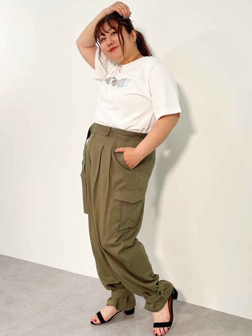 nissen Smile Models(nissen本店models)のTシャツ/カットソー「<大きいサイズ>綿100%ロゴ箔プリントTシャツ シックスタイル」を使ったコーディネート