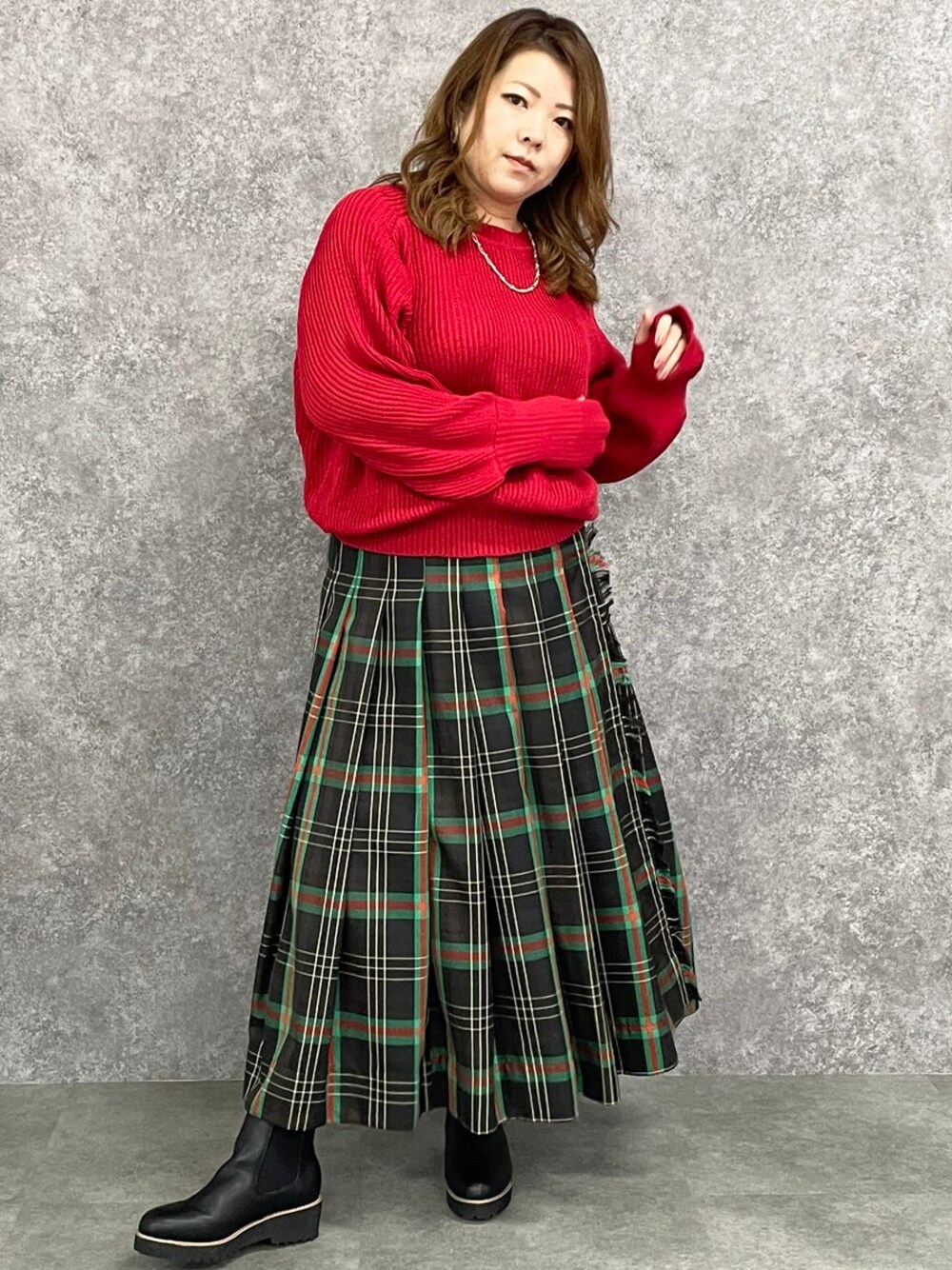 nissen Smile Models(nissen本店models)のスカート「<大きいサイズ> チェックタックマキシスカート GEVS.」を使ったコーディネート