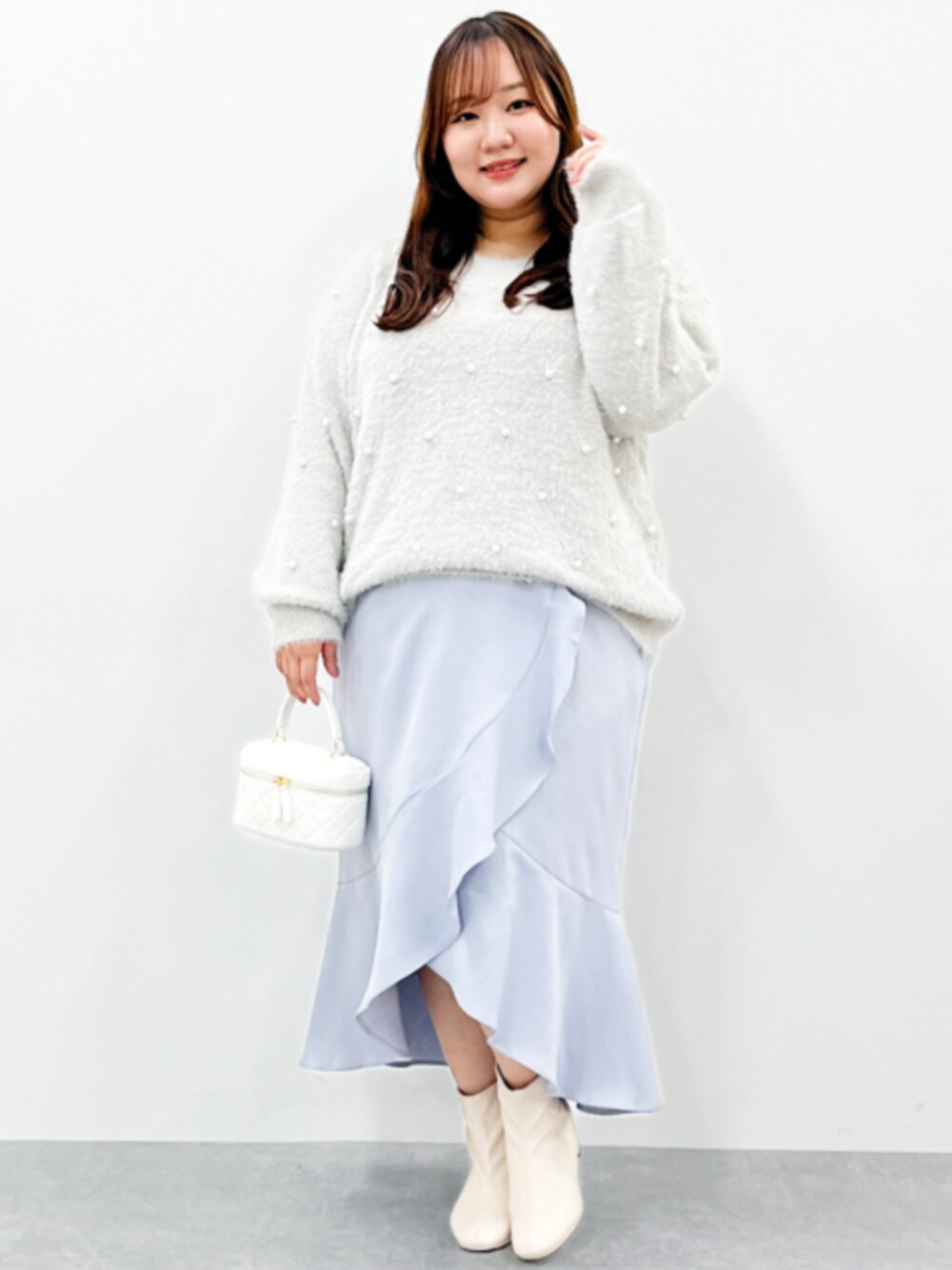 nissen Smile Models(nissen本店models)のニット/セーター「大きいサイズスクエア柄パール調シャギーニットmarun」を使ったコーディネート