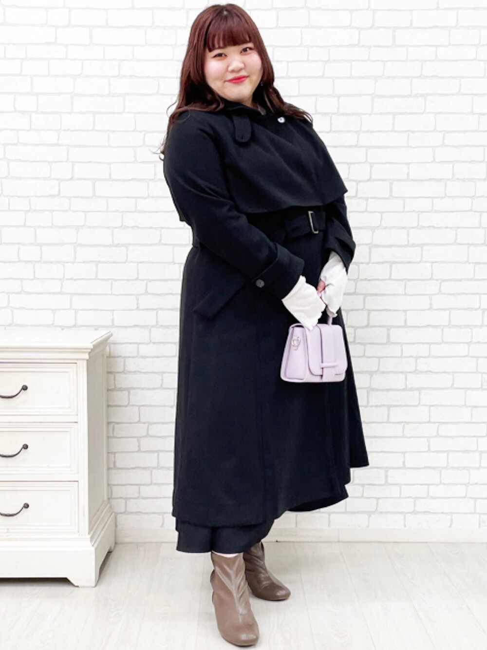 nissen Smile Models(nissen本店models)のチェスターコート「<大きいサイズ> 2wayカラーロングコート marun」を使ったコーディネート