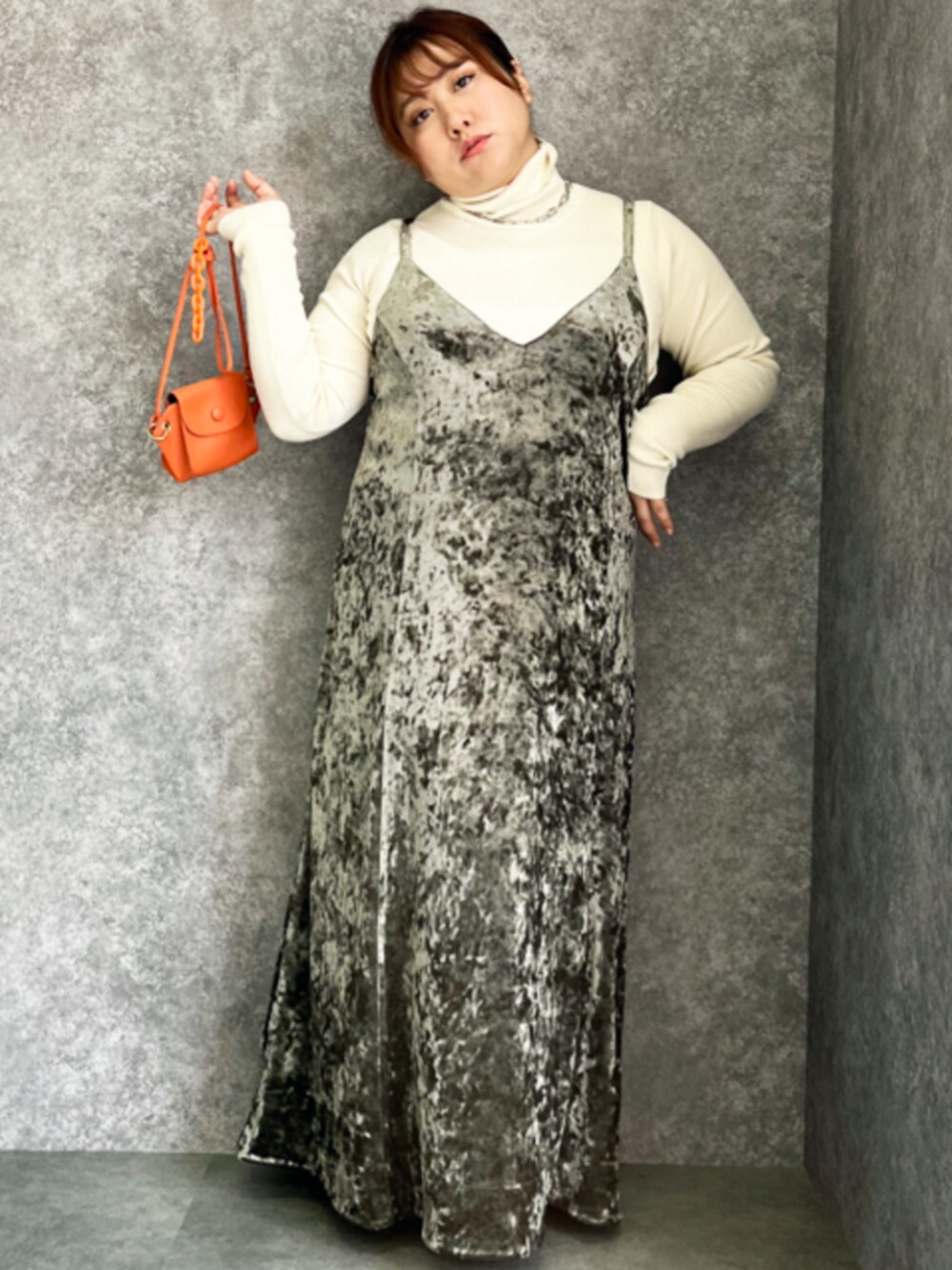 nissen Smile Models(nissen本店models)のワンピース「<大きいサイズ> クラッシュベロアキャミソールロングワンピース GEVS.」を使ったコーディネート