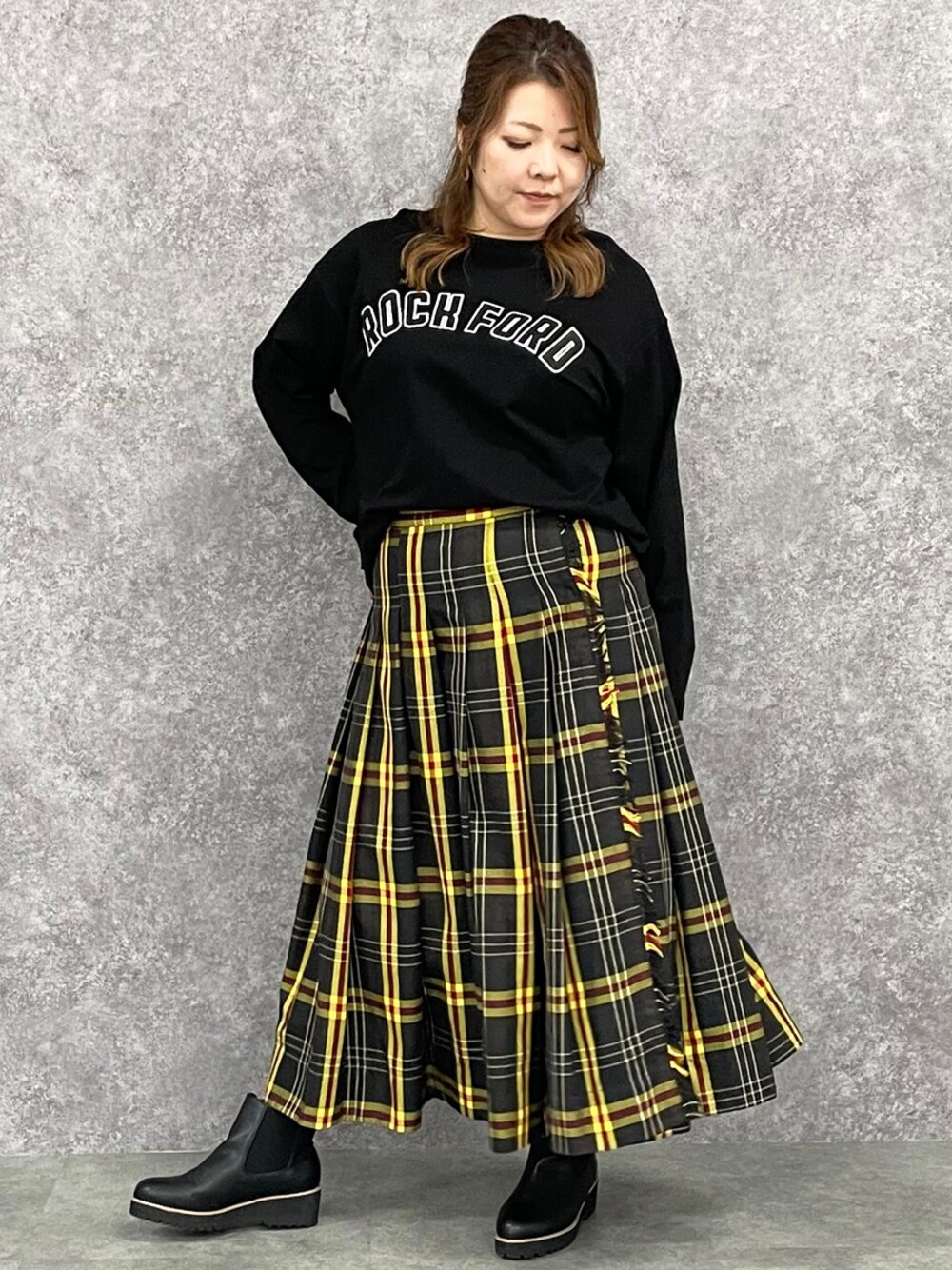 nissen Smile Models(nissen本店models)のスカート「<大きいサイズ> チェックタックマキシスカート GEVS.」を使ったコーディネート