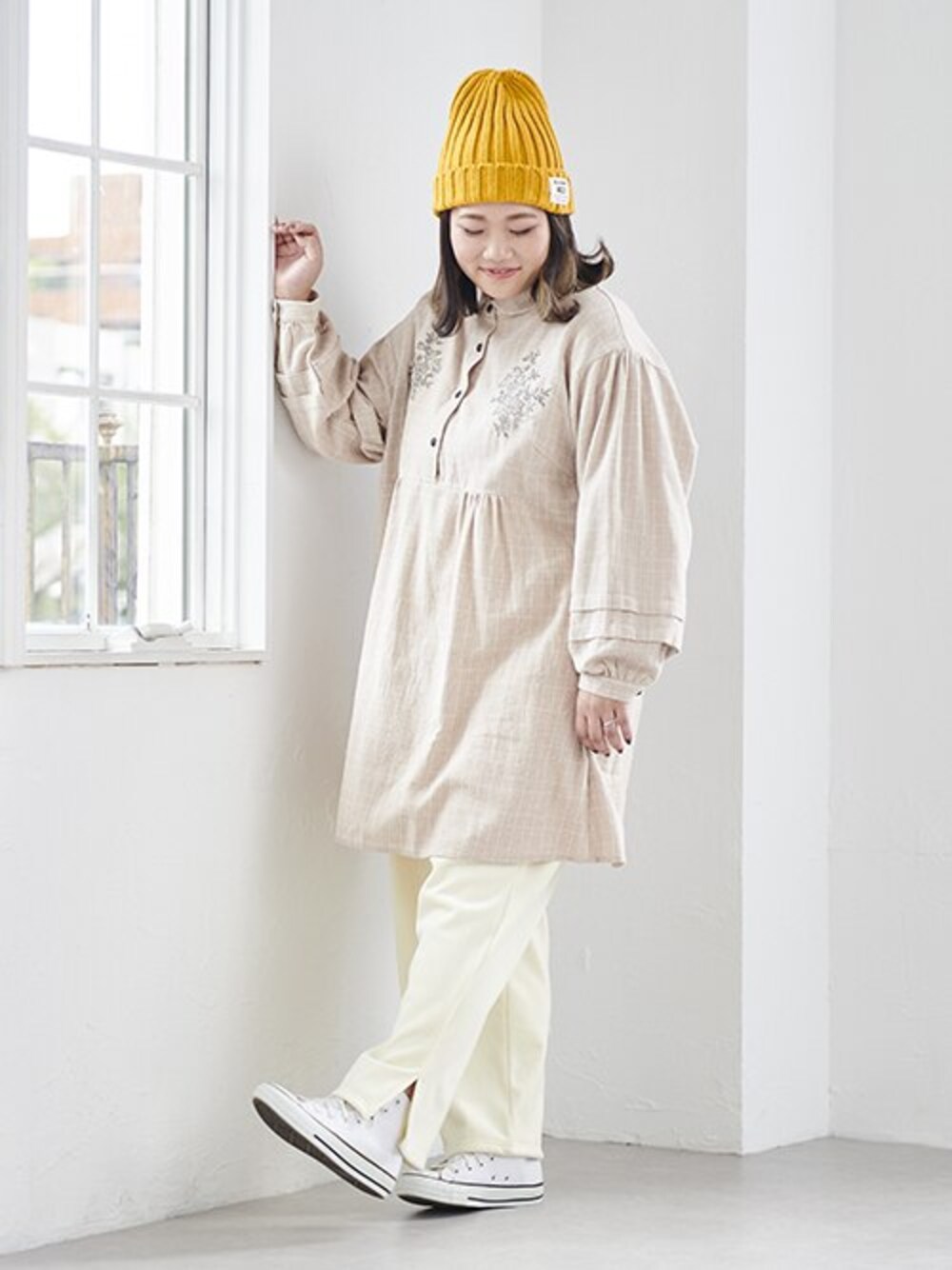 nissen Smile Models(nissen本店models)のチュニック「大きいサイズ 綿100%肌触り柔らか起毛刺しゅう使いビエラチュニックブラウス」を使ったコーディネート