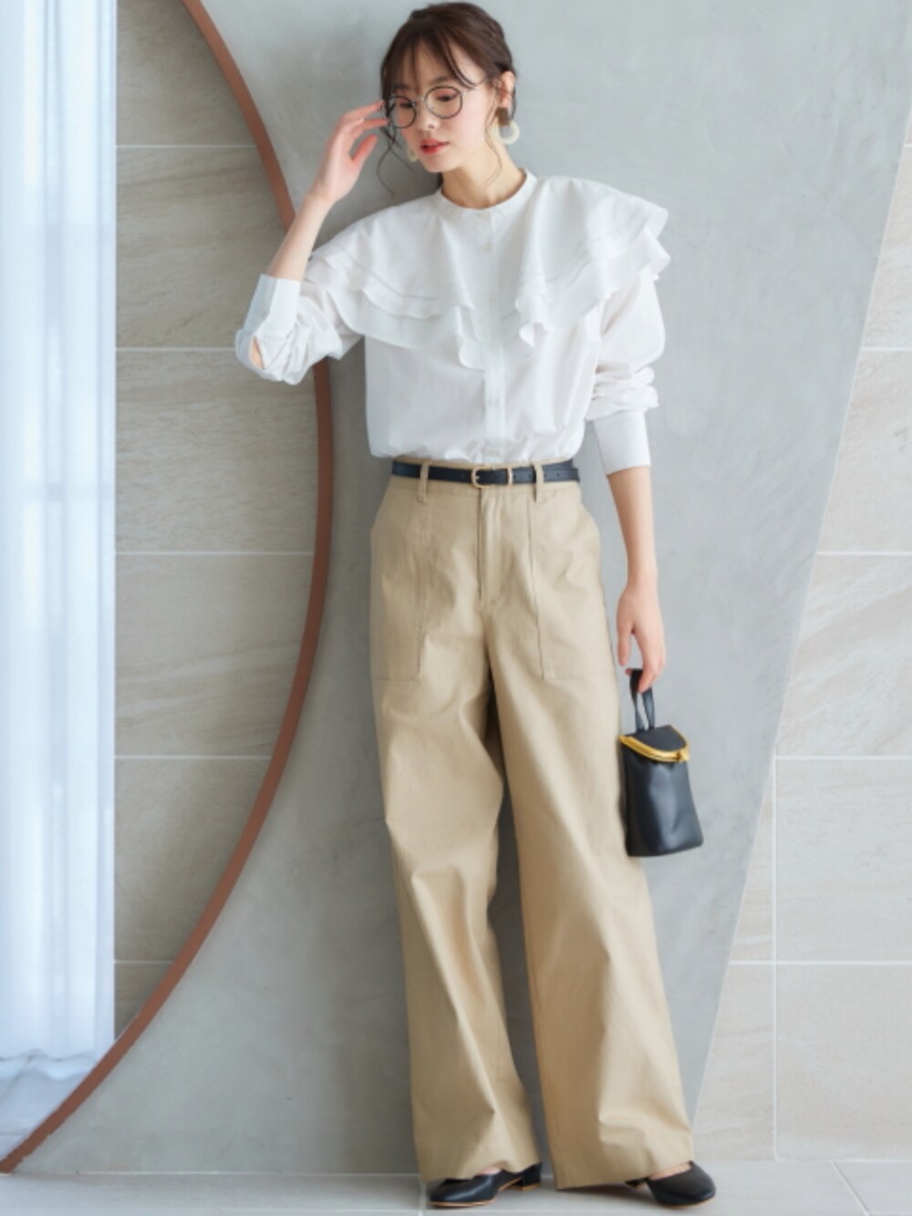 nissen Smile Models(nissen本店models)のシャツ/ブラウス「大きいサイズ ビッグフリルカラーブラウス miclat」を使ったコーディネート