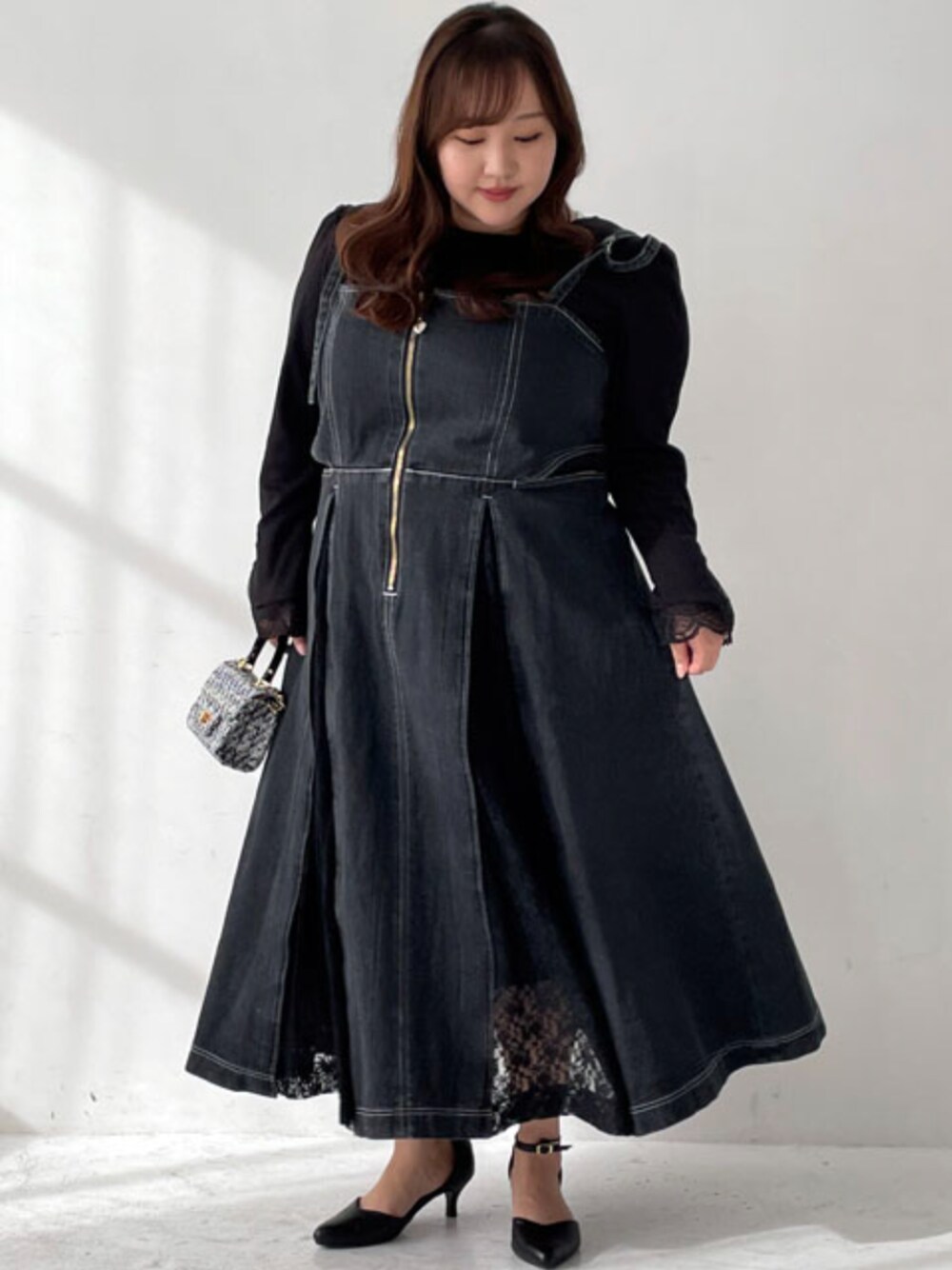 nissen Smile Models(nissen本店models)のワンピース「大きいサイズ デニムジャンパースカート marun」を使ったコーディネート