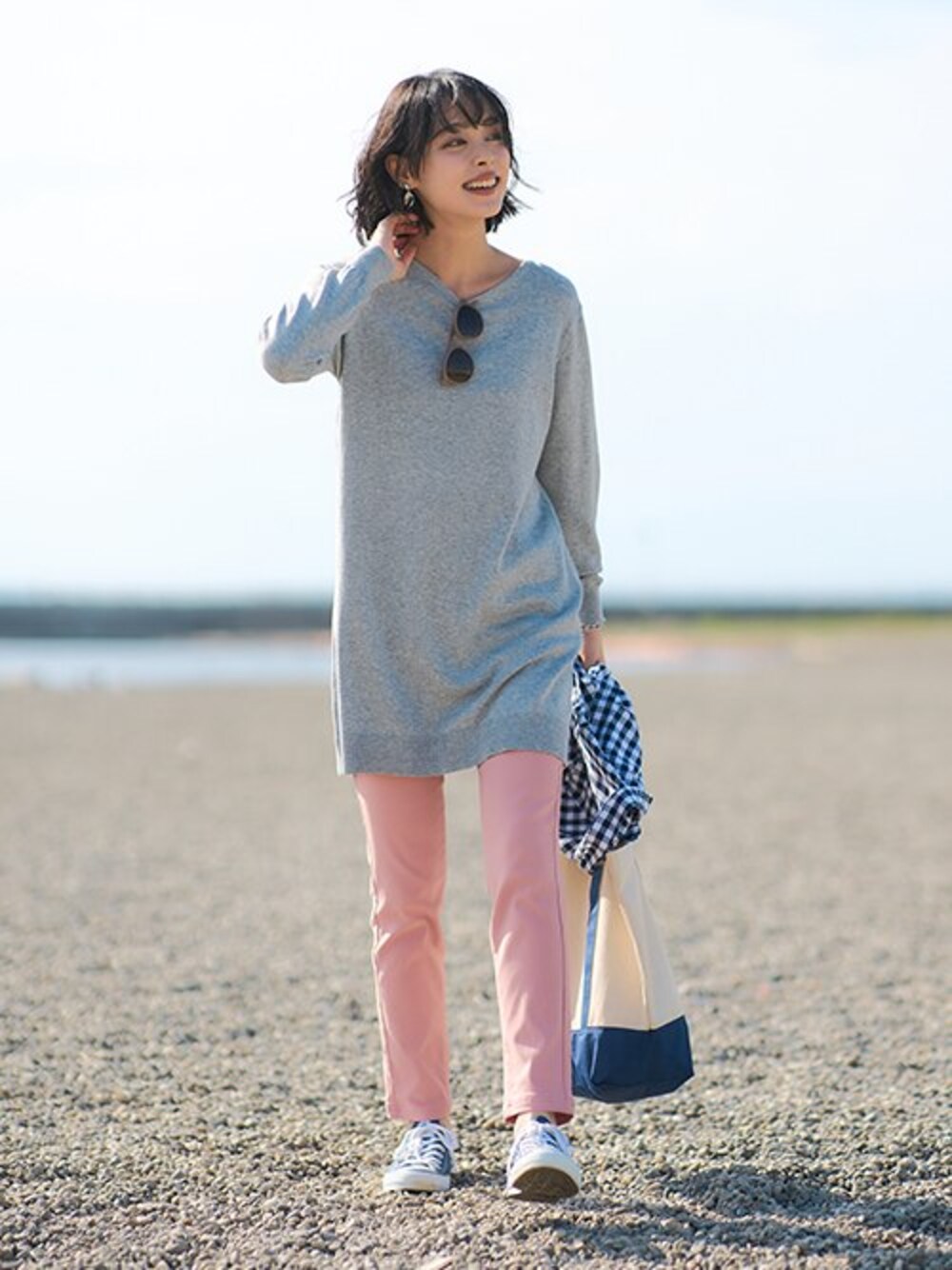 nissen Smile Models(nissen本店models)のチュニック「大きいサイズ洗濯機で洗えてハンガー干しできる綿混ニットゆるチュニック(毛玉防止)(チクチクしにくい)」を使ったコーディネート