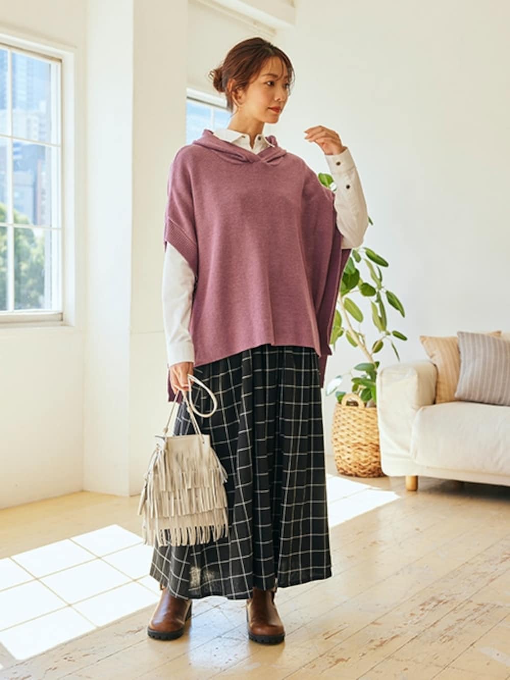 nissen Smile Models(nissen本店models)のニット/セーター「大きいサイズ フード付綿混ニットポンチョ」を使ったコーディネート