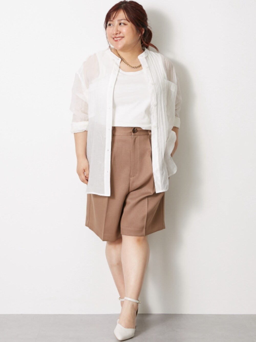 nissen Smile Models(nissen本店models)のシャツ/ブラウス「大きいサイズ バンドカラーシアーシャツ miclat」を使ったコーディネート