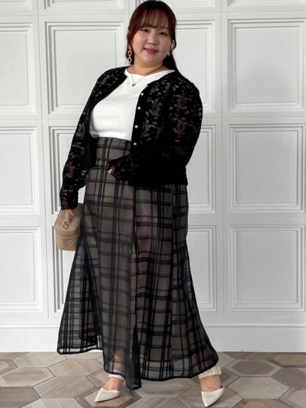 nissen Smile Models(nissen本店models)のスカート「【販売終了】<大きいサイズ> シアーチェックスカート marun」を使ったコーディネート