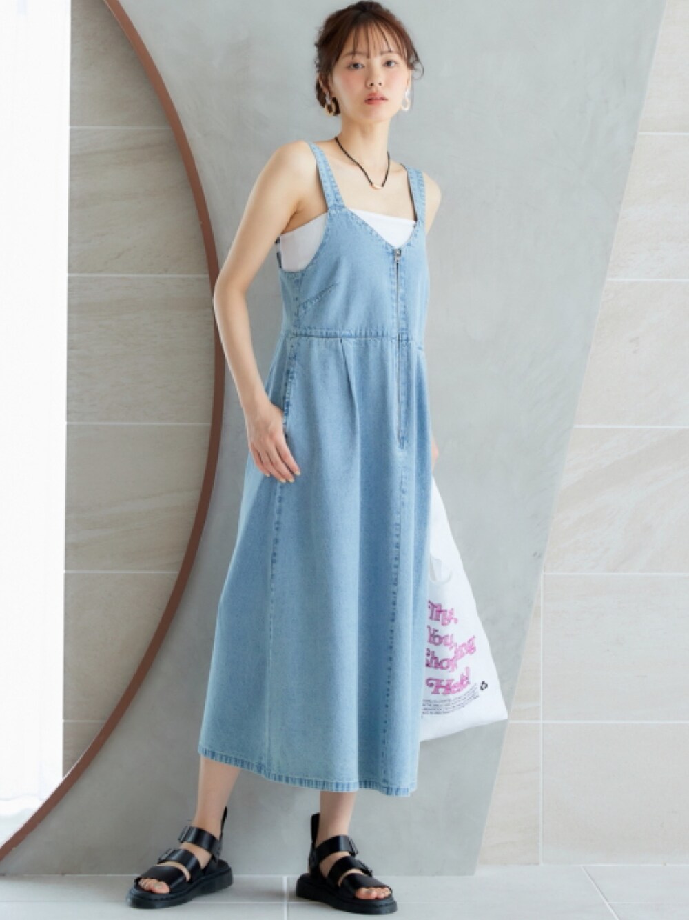 nissen Smile Models(nissen本店models)のワンピース「大きいサイズ フロントジップデニムジャンパースカート miclat」を使ったコーディネート