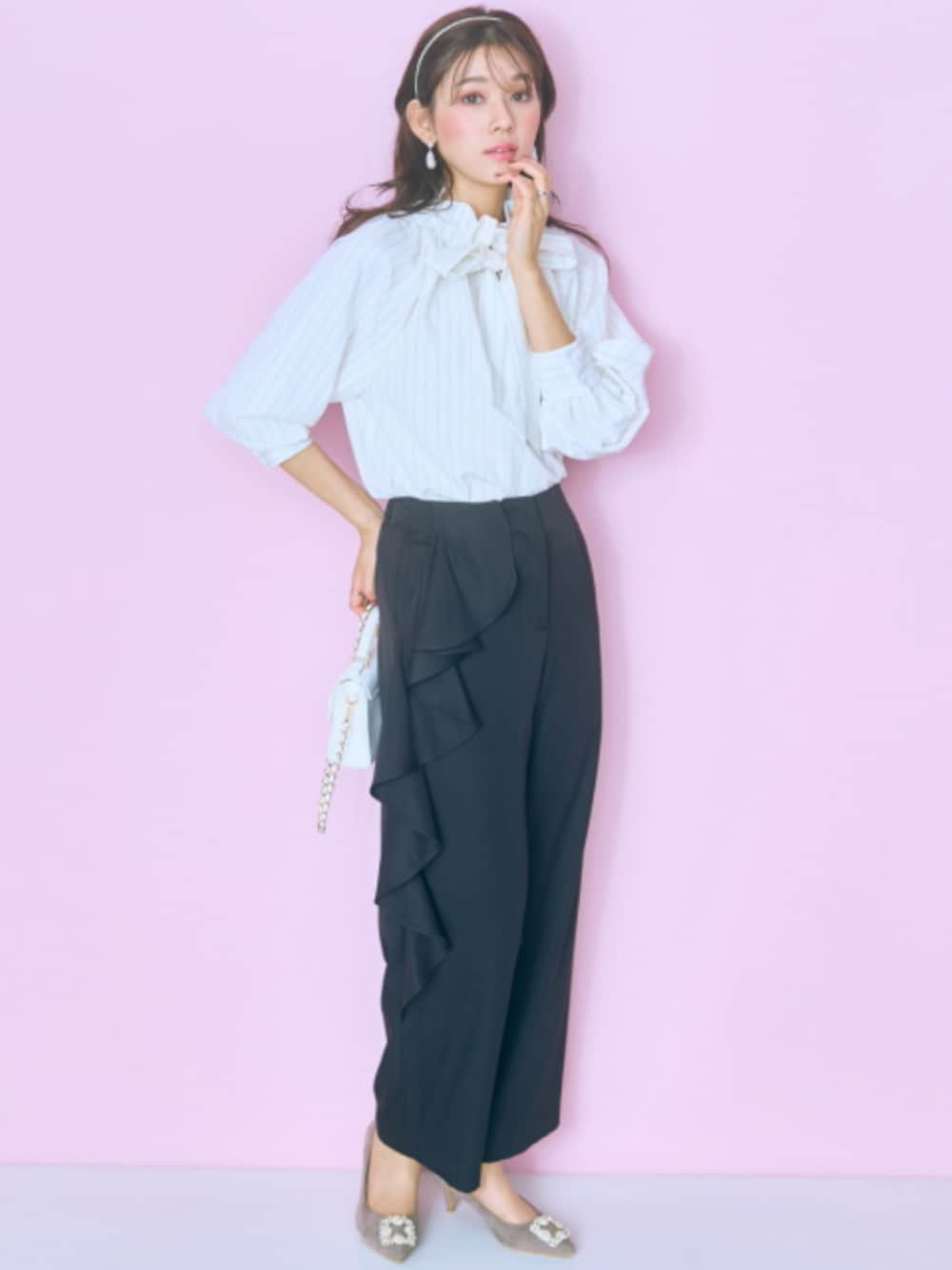 nissen Smile Models(nissen本店models)のシャツ/ブラウス「<大きいサイズ> ピンストライプリボンタイブラウス marun」を使ったコーディネート