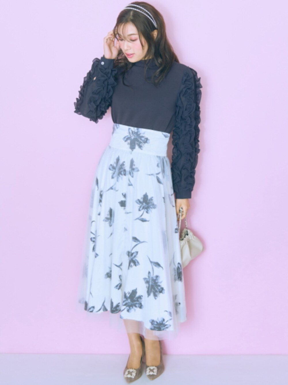 nissen Smile Models(nissen本店models)のスカート「<大きいサイズ> オーバーチュールフラワープリントスカート marun」を使ったコーディネート