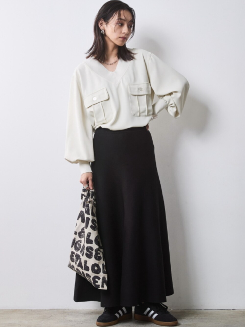 nissen Smile Models(nissen本店models)のスカート「フレアロングニットスカート <大きいサイズ有>シックスタイル」を使ったコーディネート