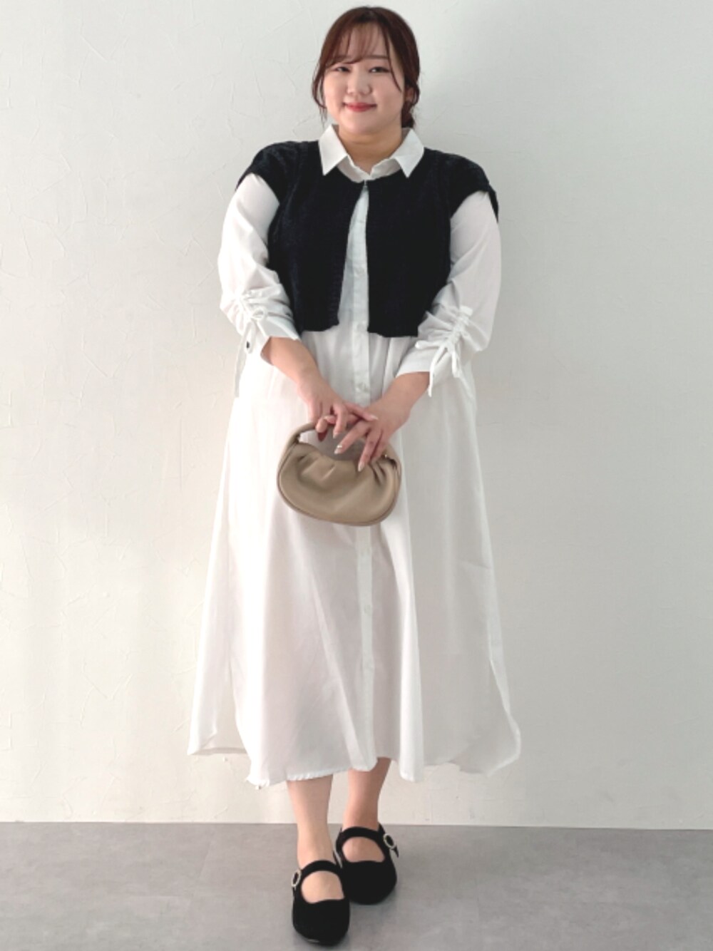 nissen Smile Models(nissen本店models)のワンピース「袖ドロストニット使いシャツワンピース【OtonaSMILE】」を使ったコーディネート