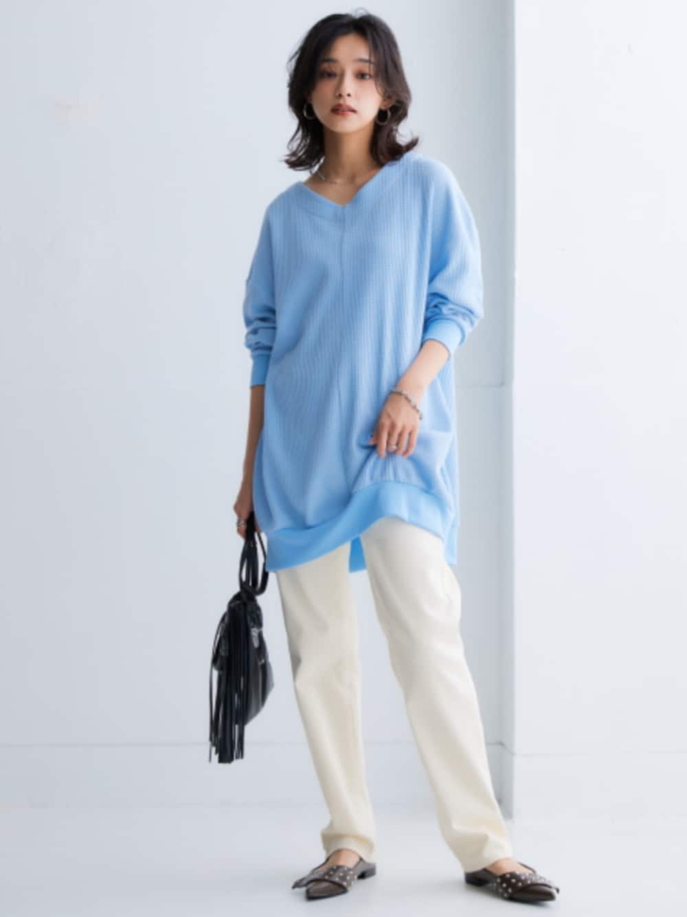 nissen Smile Models(nissen本店models)のチュニック「ワッフル素材ロング丈ドルマントップス(UVカット)<大きいサイズ有>」を使ったコーディネート