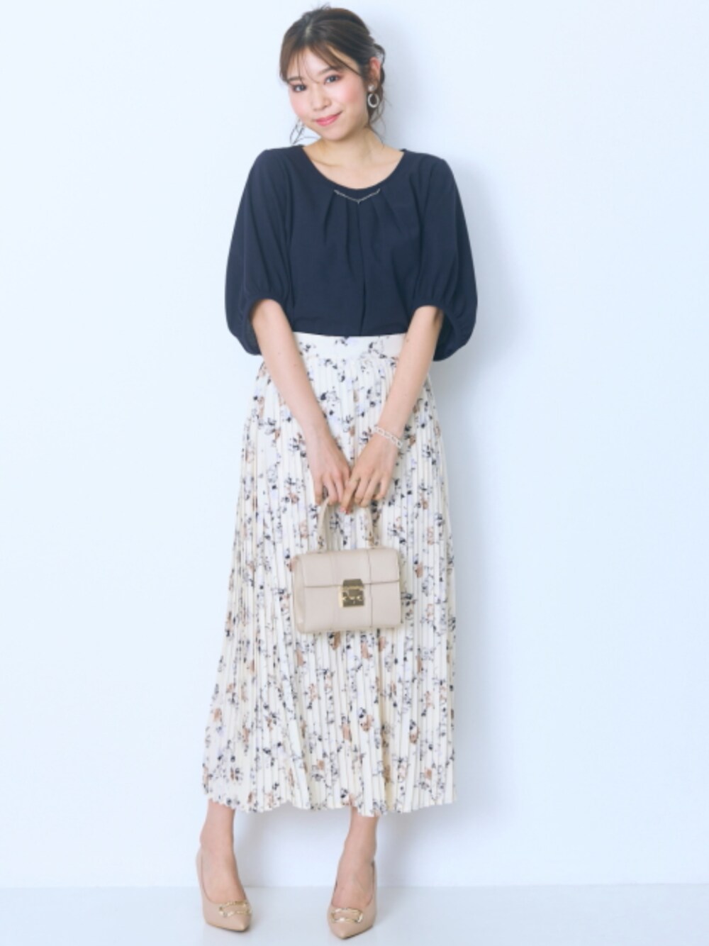nissen Smile Models(nissen本店models)のスカート「<大きいサイズ>花柄プリーツスカート marun」を使ったコーディネート