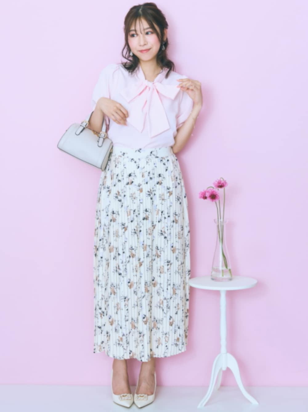 nissen Smile Models(nissen本店models)のスカート「<大きいサイズ>花柄プリーツスカート marun」を使ったコーディネート