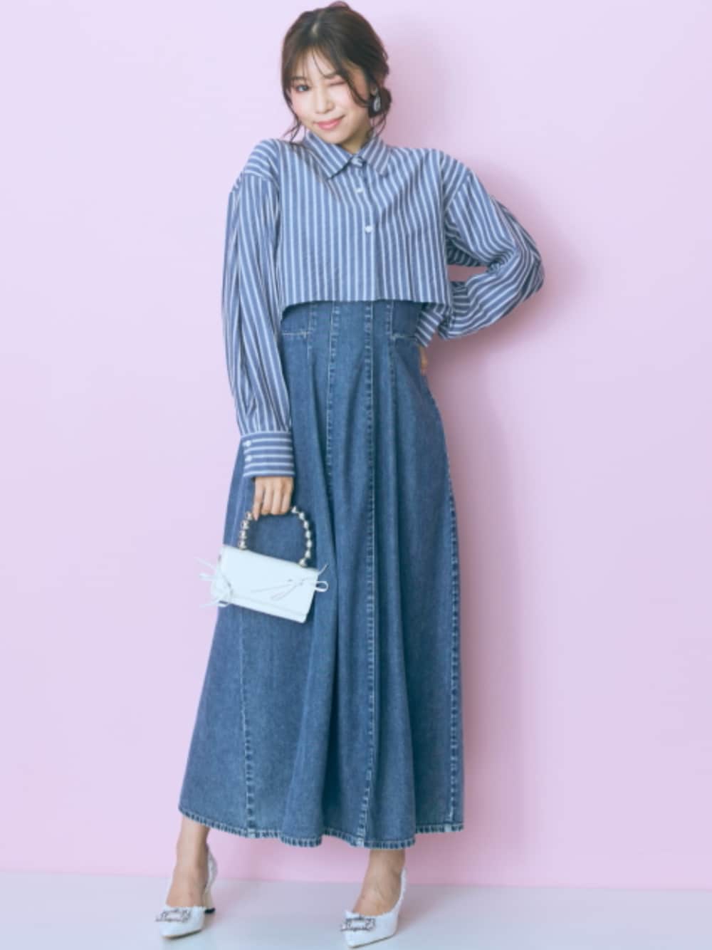 nissen Smile Models(nissen本店models)のワンピース「<大きいサイズ>2点セット(ストライプシャツ+ワンピース) marun」を使ったコーディネート