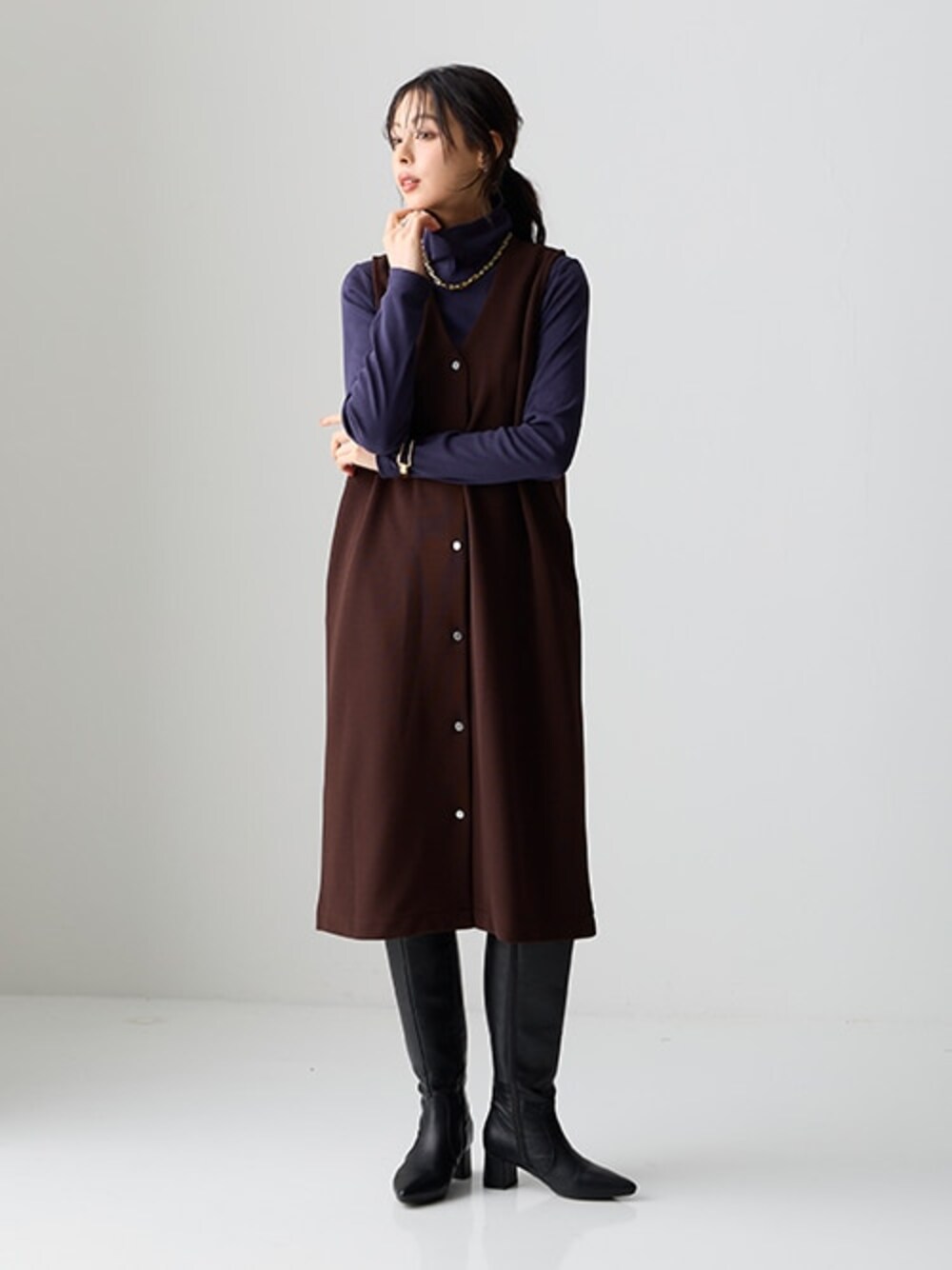 nissen Smile Models(nissen本店models)のTシャツ/カットソー「綿100%フライス素材タートルネック長袖Tシャツ(UVカット)<大きいサイズ有>」を使ったコーディネート