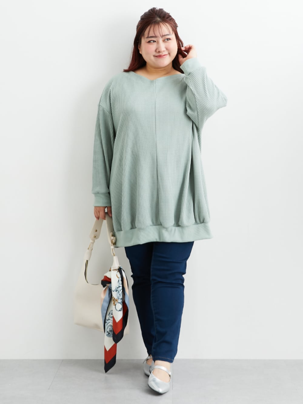nissen Smile Models(nissen本店models)のチュニック「ワッフル素材ロング丈ドルマントップス(UVカット)<大きいサイズ有>」を使ったコーディネート