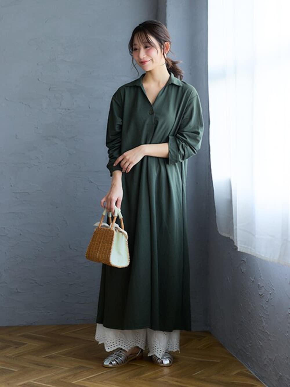 nissen Smile Models(nissen本店models)のワンピース「<大きいサイズ>美ラクRUタッチ衿付スキッパーワンピース(汗染み防止・UVカット)」を使ったコーディネート