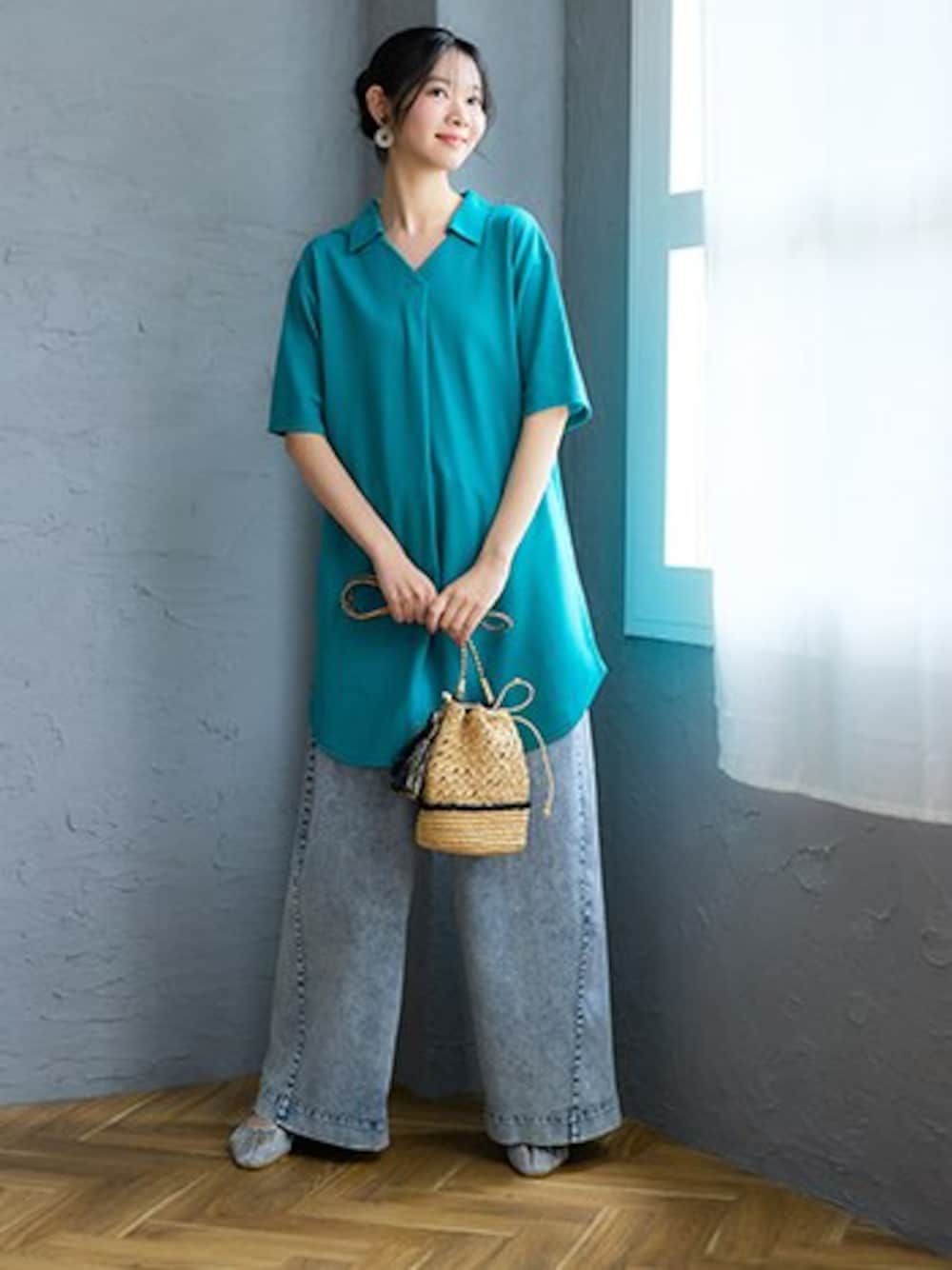 nissen Smile Models(nissen本店models)のチュニック「吸汗速乾・UVカットカノコゆるシルエット5分袖ポロチュニック<大きいサイズ有>」を使ったコーディネート