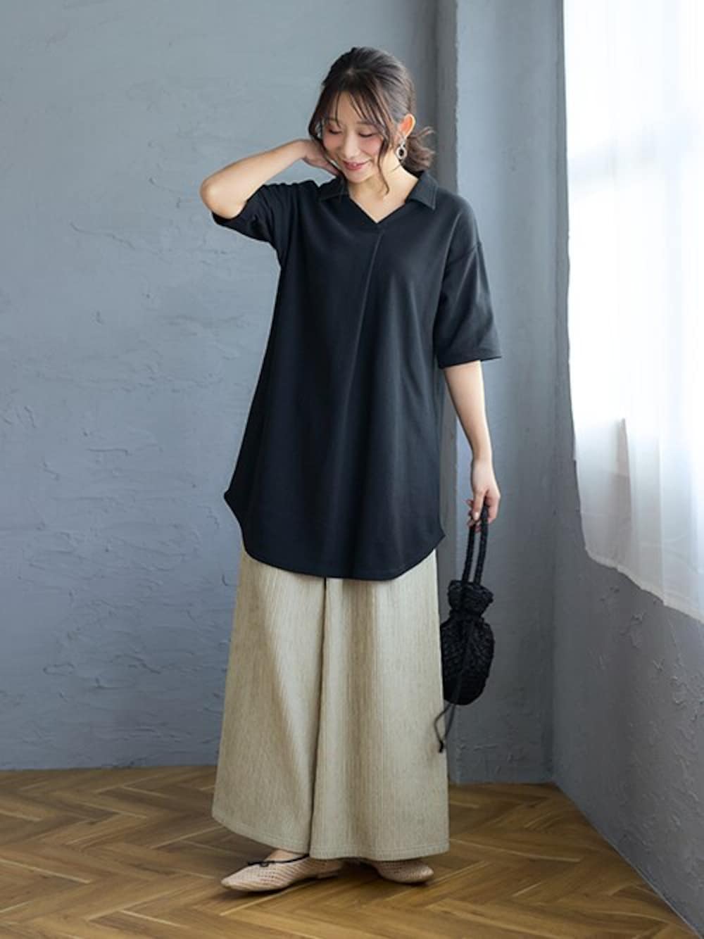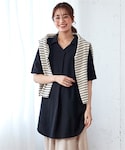 nissen Smile Models(nissen本店models)のチュニック「吸汗速乾・UVカットカノコゆるシルエット5分袖ポロチュニック<大きいサイズ有>」を使ったコーディネート
