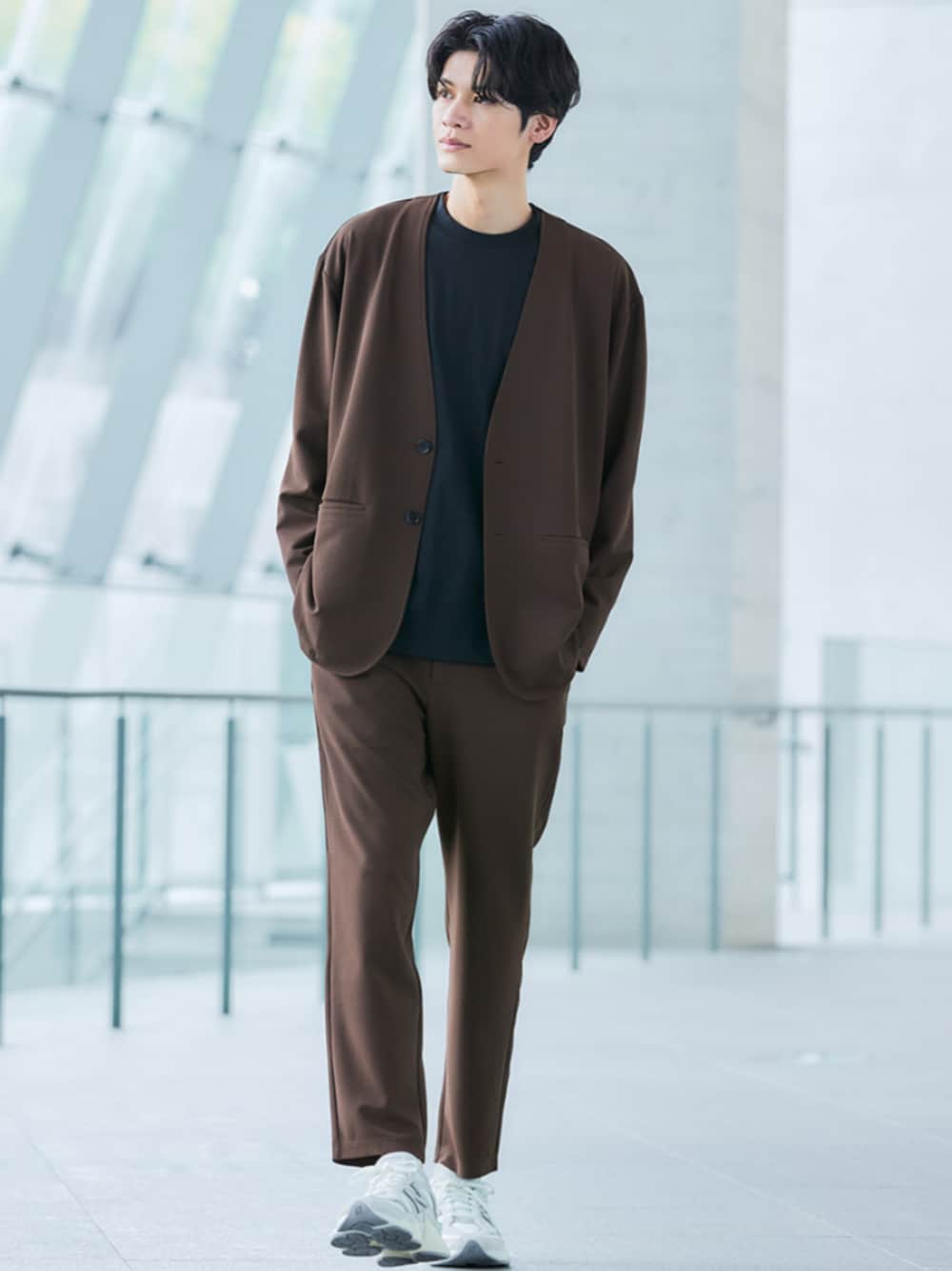 nissen Mens Models(nissen本店models)のノーカラージャケット「洗濯機OK!ふくれ織風カットソーノーカラージャケット (M~10Lサイズ)」を使ったコーディネート