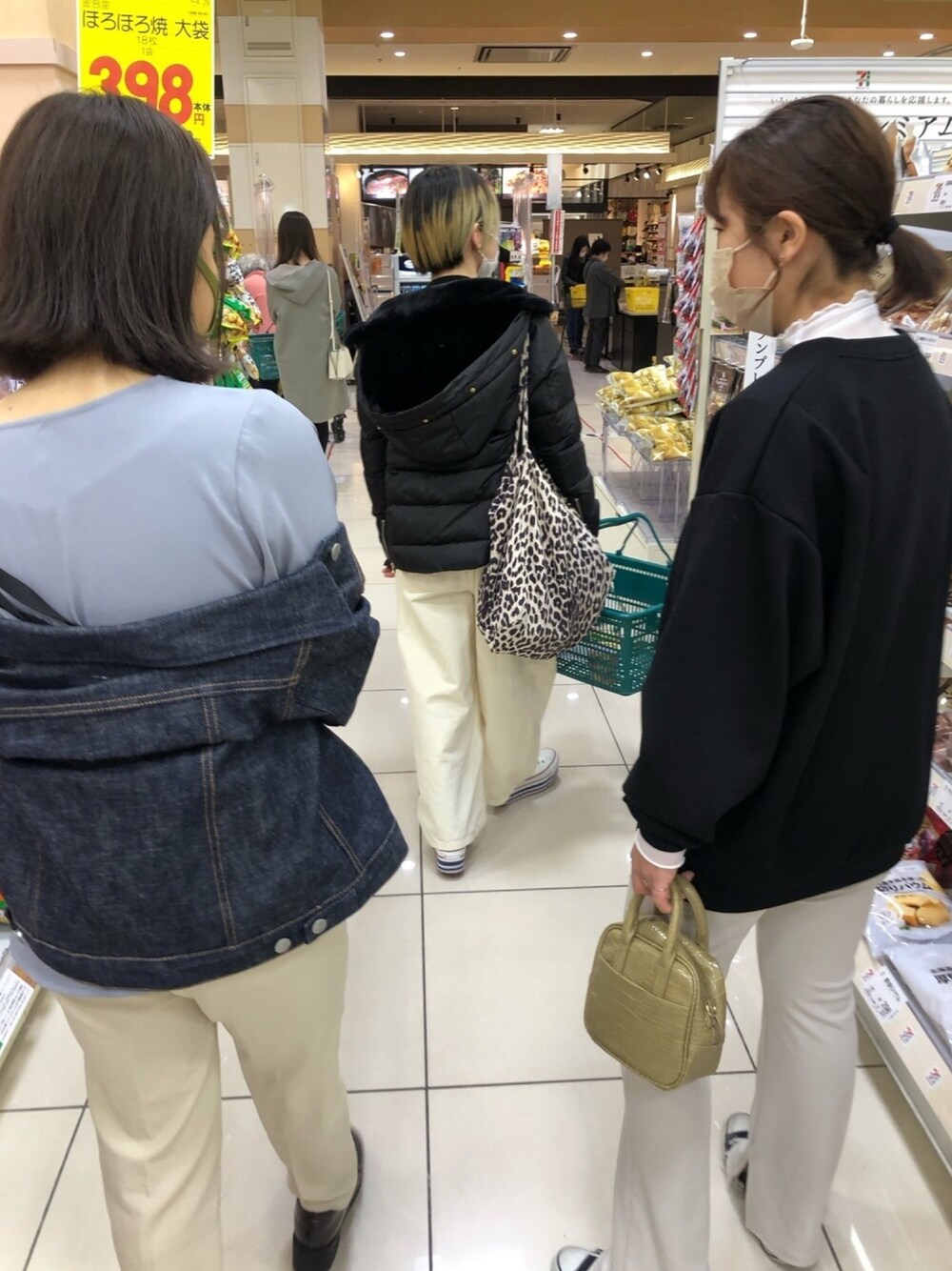 ブラック系のスウェット、グリーン系のバッグ、ホワイト系のパンツを着用したレディースの春コーディネートの1枚目の写真