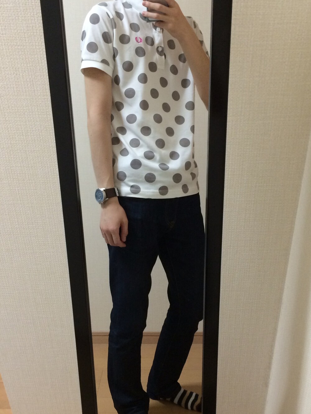 持っているポロシャツで一番お気に入りの物でコーデしました。 パンツはUNIQLOのデニムです。 例に漏れず屋内なのでシューズはなし(._.)