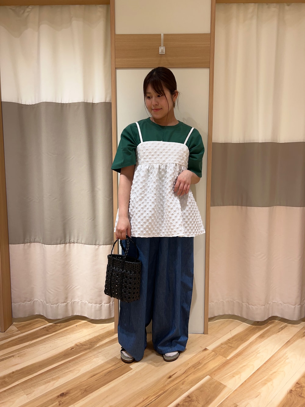 こんにちは! ご覧いただきありがとうございます🦔 白とデニムで夏らしく、緑のTシャツをアクセントにお出かけコーデを組んでみました! キャミブラウスは肩紐が調節できて、後ろのリボンがとても可愛いです! ぜひオンラインストアやお近くの店舗にてご覧くださいませ🌱