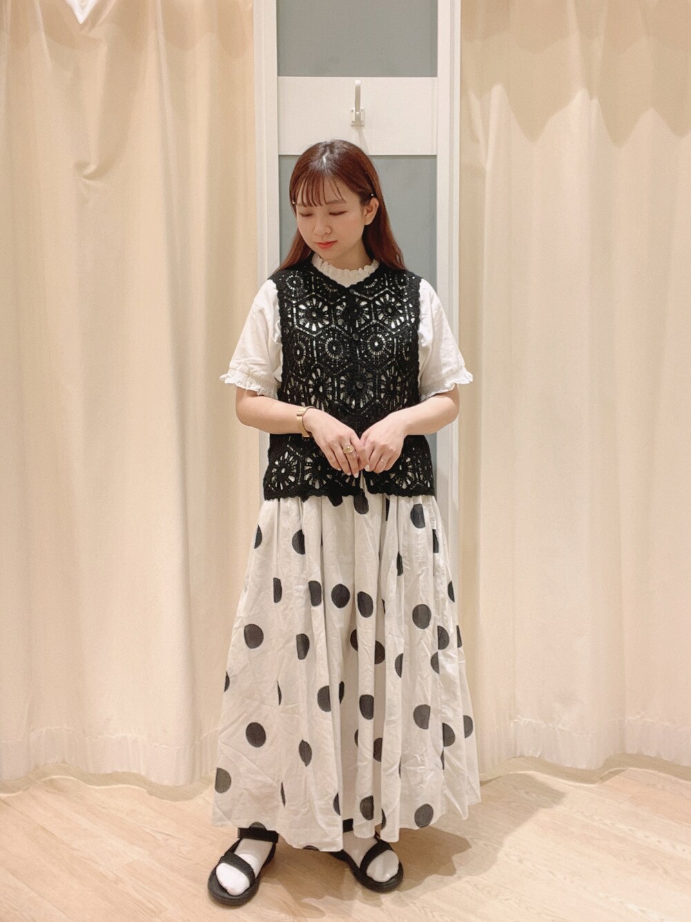 ㅤㅤㅤㅤㅤㅤㅤㅤㅤㅤㅤㅤㅤ おはようございます、 ご覧頂きありがとうございます☺️ ㅤㅤㅤㅤㅤㅤㅤㅤㅤㅤㅤㅤㅤ かぎ針風のベストとドットのスカート それぞれがガーリーな雰囲気ですが、 全体的にモノクロでまとめて大人っぽく 🤍