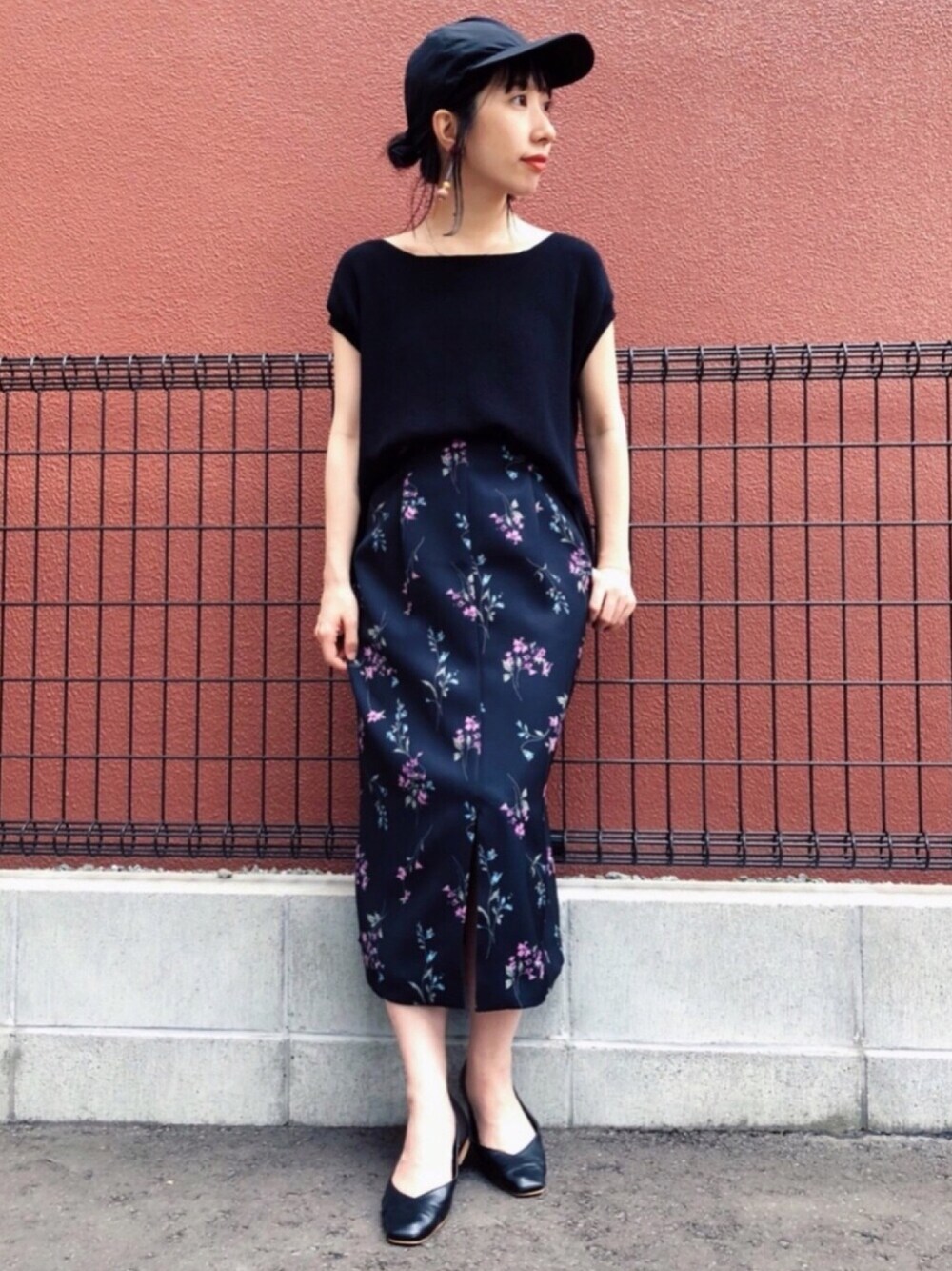 Andemiuの花柄スカートを主役に、blackコーデ✔︎ . ラフニットはボトム選ばず使いやすいお気に入りアイテム☻