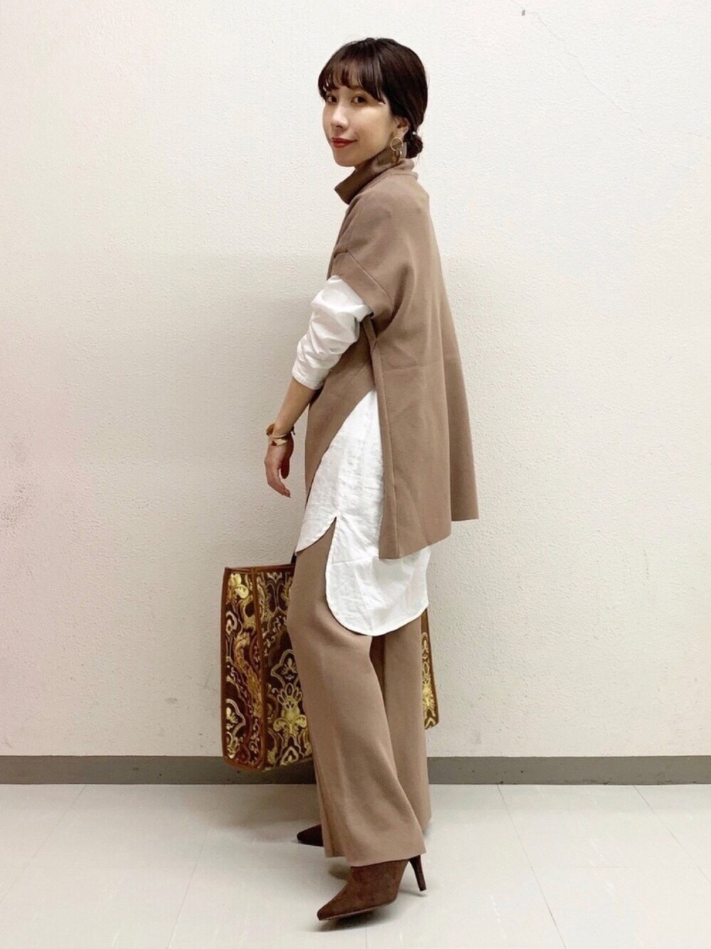 ミラノリブのニットベストは 深スリット入りでレイヤードが簡単に楽しめるデザイン💫 . ニットパンツとセットアップ風のコーディネート🧸