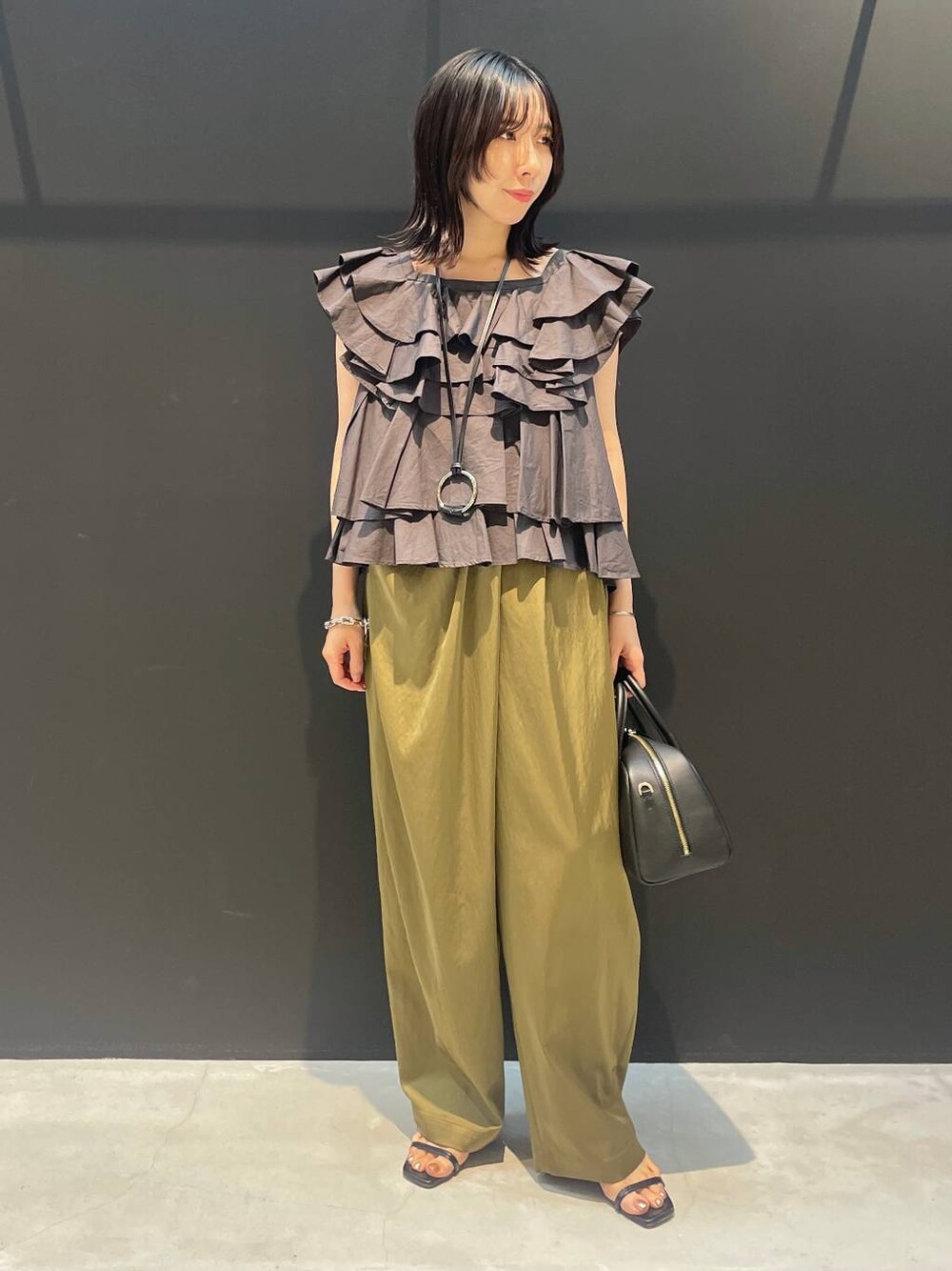 ジャストシーズンのitemたちですが、 黒レザー小物で締めて秋への移行を意識したコーデに。 ●トップス 一見甘めなフリルトップスですが、 綿100%のナチュラルな素材のおかげで 大人らしいフェミニンな印象で着られます☺︎ 生地がとっても軽いので暑い夏にぴったりです。 ●ボトムス ドレープがコーデのアクセントになるデザイン。 光沢もあり綺麗な色味はこなれた印象ですが、ウエストはallゴムなので、履き心地もとっても楽です。 この日はベルトをせずに、ウエストを1折りして着用してます。