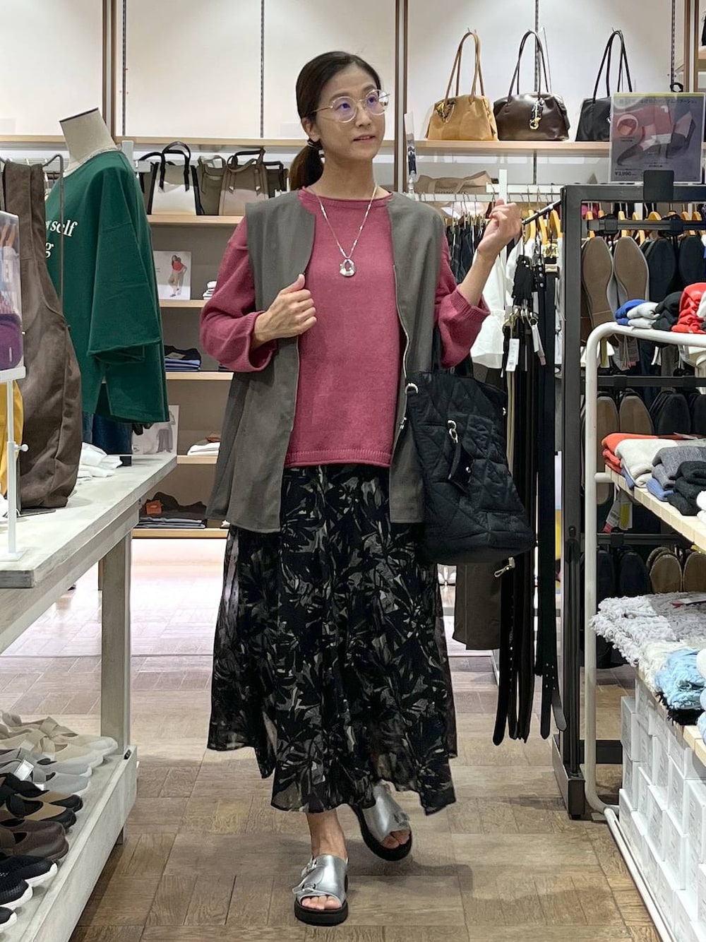 ⭐各アイテムのおすすめポイント  ̄ ̄ ̄ ̄ ̄ ̄ ̄ ̄ ̄ ̄ ̄ ̄ ̄ ̄ ̄ ̄ ̄ エアリーリラックススカート ブラックボタニカル を着回したコーディネート♪ 【スカート】 スカートは、夏も好評のエアリーリラックススカート! 裏地がついたので、シーズンレス着用可能。 両サイドにポケットがあるので、実用的♪ ショート丈とレギュラー丈があります。 今回は、レギュラー丈を着ています♪ 私もお気に入りのスカート♪ 【ニット】 ドライタッチ素材で大人の涼やかスタイル さらりとしたドライな肌触りが特徴のペーパーヤーンニット。 ざっくりとした素材感とカットオフのようなカジュアルデザインのボートネック。 ゆとりのあるサイジングや肩落ちで華奢見え。 今回は、Mサイズを着ています♪ そでも長めのゆるっと着れる大きさです♪ 【ベスト】 しわになりにくい、お手入れラクラクシリーズ。 フロントジップで、Tシャツにさらっと羽織るだけでOK。 前を閉じてノースリーブブラウスのように着用しても可愛いです。 後ろのみにギャザー切り替え入り。 前はスッキリ見えるシルエットです。 両サイドにポケット付きで実用的。 今回は、Lサイズを着ています♪ こちらは、薄手の生地ですが、もう少し厚手のピーチサテン生地も入荷しています♪ ニベーカリーページで他の着こなしやサイズ違いもアップしています♪ ぜひ、フォローもお願い致します♪ 下からも商品が確認できますし、購入もできます♪ ぜひ、クリックしてみてください♪ ↓↓↓