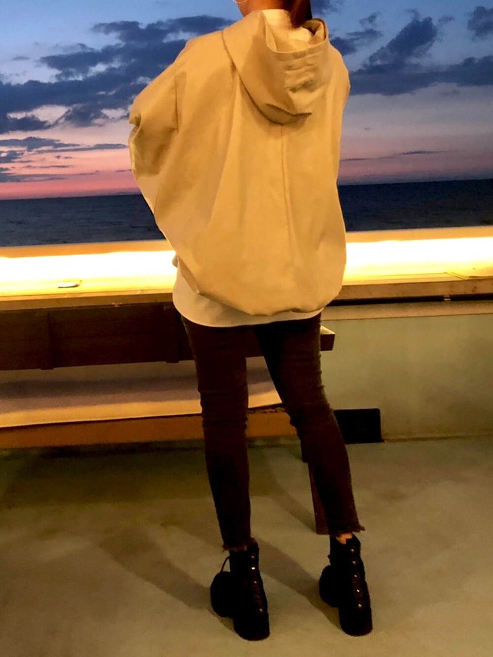 お昼は半袖 夕暮れ以降は風が冷たい エコレザーのパーカーがとても使いやすい💫