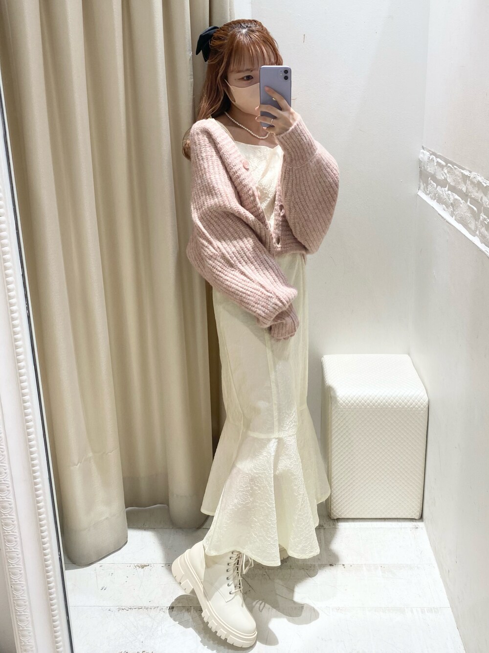 ピンク×ホワイトでガーリーなコーデに♡ ナイスクラップの淡色ニットカーディガンはゆるっと感が本当に可愛くてお気に入り!