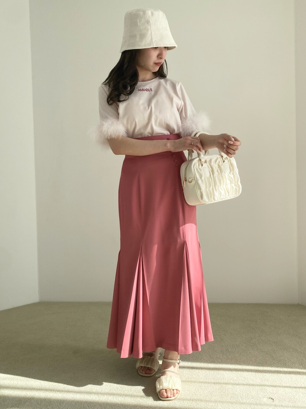 ピンクでまとめたコーデ♡ ファー付きのTシャツはカジュアルになりすぎないからガーリーな方にもおすすめ!