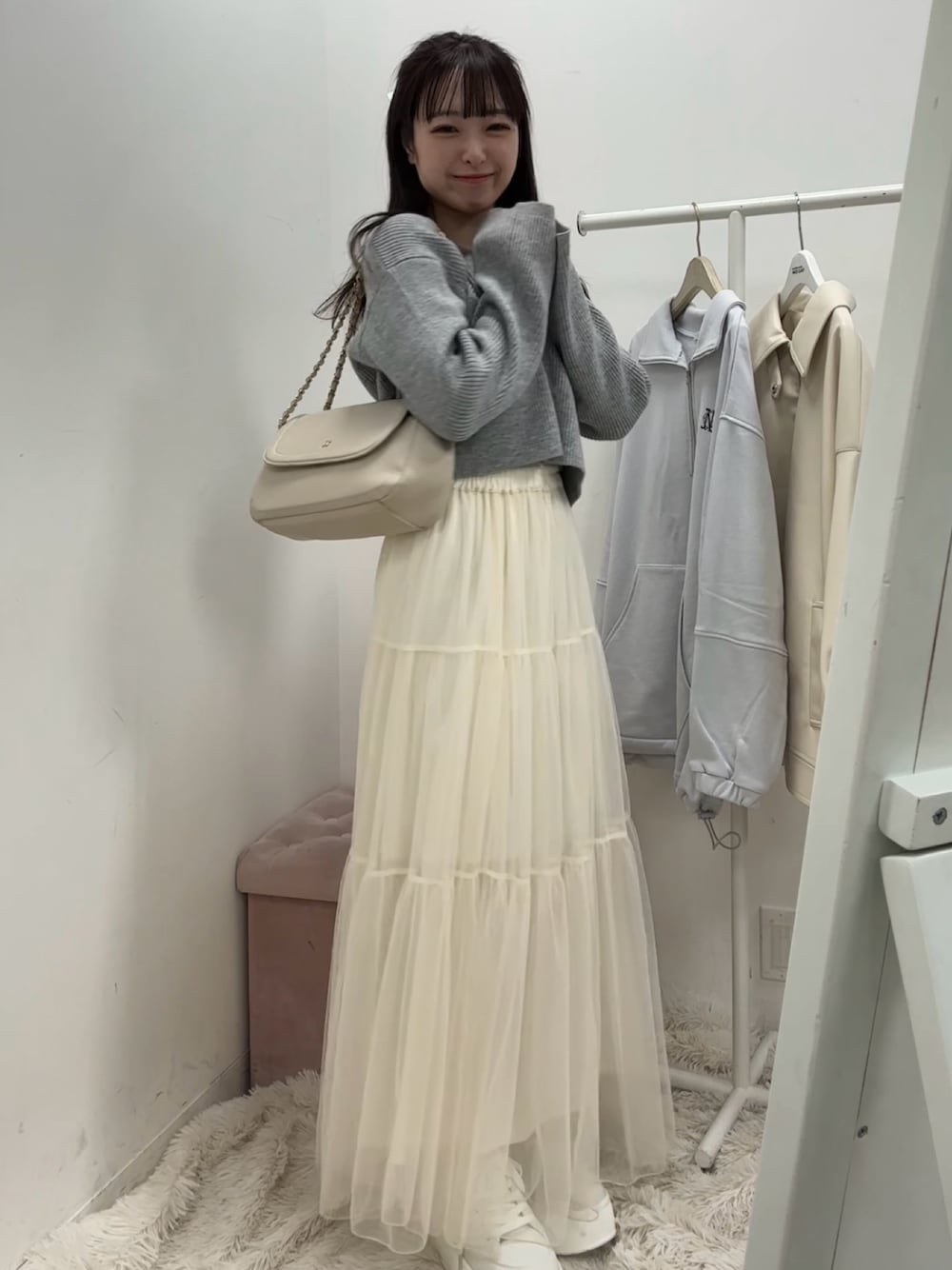 ハートボタンが可愛いニットカーデと、 お気に入りのチュールスカート! スカートはチュールですが ボリューム出すぎないシルエットで骨格ストレートも綺麗に着れました!!♡ 下着の透け感は裏地が中にあるので気になりません!